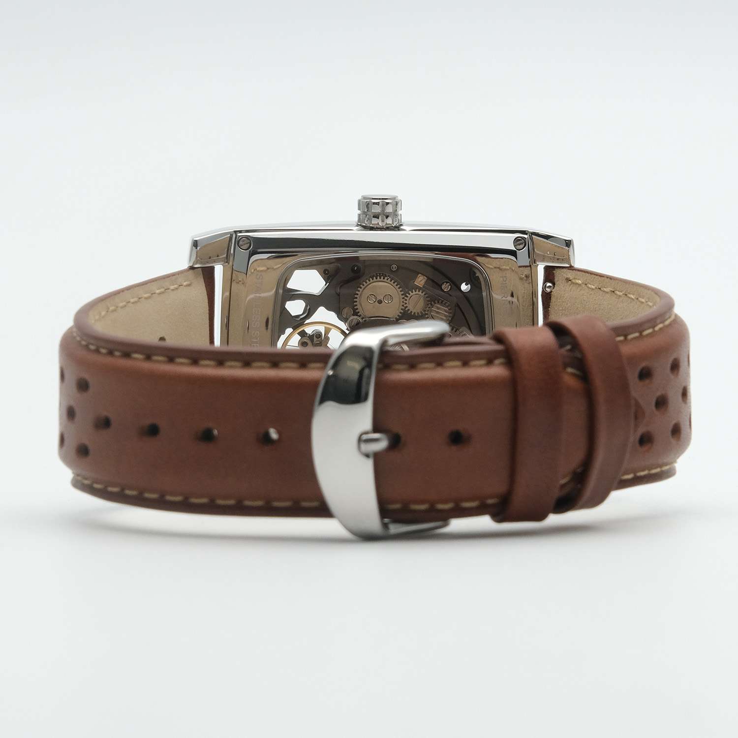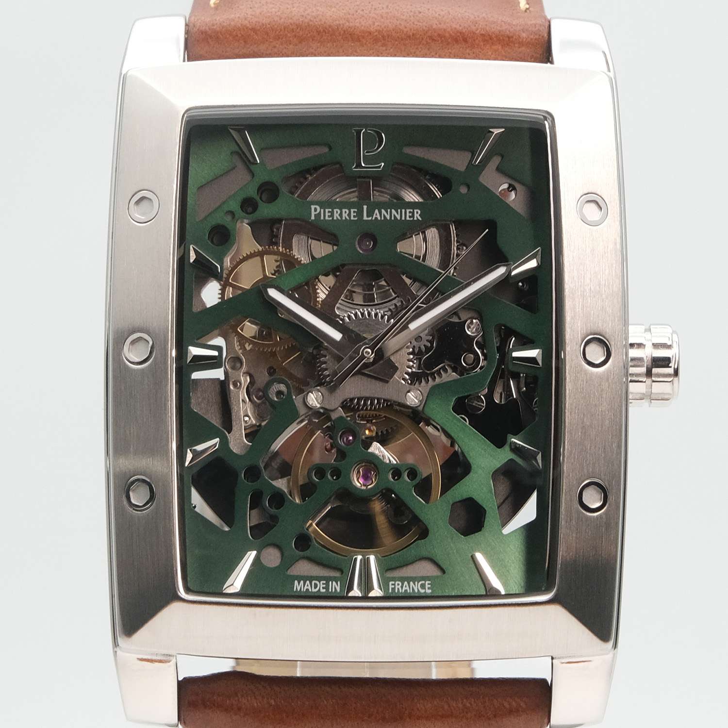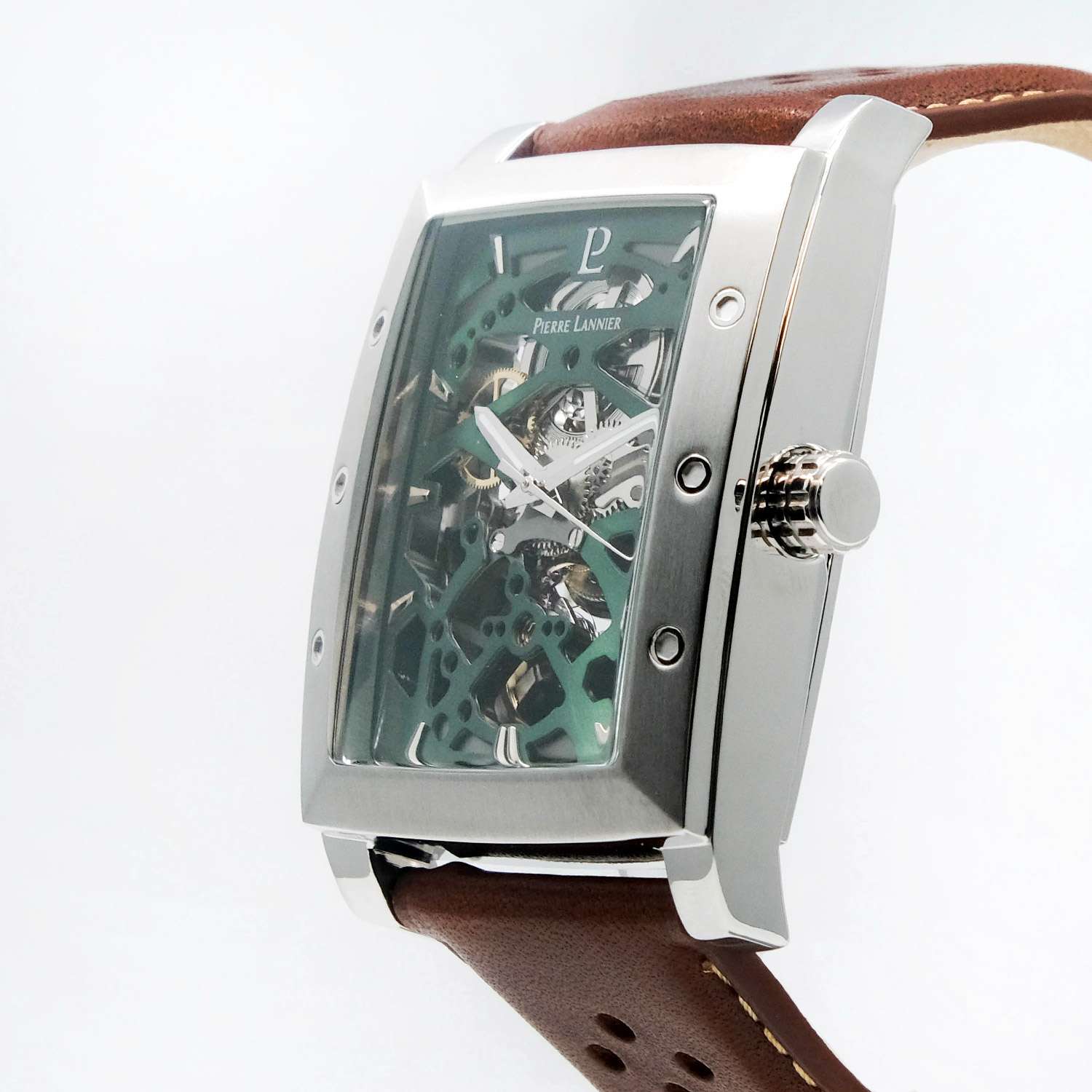Мужские механические часы Pierre Lannier Hector 342A174 представляют собой уникальное сочетание винтажного стиля и современных технологий с корпусом "тонно" размером 36×42 мм из нержавеющей стали и прозрачным зеленым скелетонизированным циферблатом, раскрывающим работу автоматического механизма. Модель оснащена автоматическим механизмом с ручным подзаводом и 40-часовым запасом хода, демонстрирующим точное движение стрелок через прозрачный циферблат. Защиту обеспечивает устойчивое к царапинам минеральное стеклоМинеральное стеклоМинеральное стекло представляет собой искусственно выращенный минерал кварца. Такое стекло отличается особой устойчивостью к повреждениям и царапинам. Уступает по некоторым качествам сапфировому стеклу., а водонепроницаемость WR50 (5 бар) позволяет использовать часы при плавании в бассейне. Кожаный ремешок из коричневой кожи махагони с перфорацией шириной 26 мм и классической пряжкой добавляет ретро-характер и легко заменяется на другие ремешки коллекции. Особенности включают матово-полированную отделку корпуса, серебристые стрелки и индексы на зеленом циферблате, а также прозрачную заднюю крышку, демонстрирующую механизм.