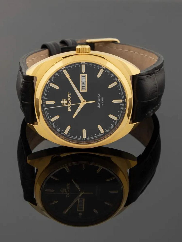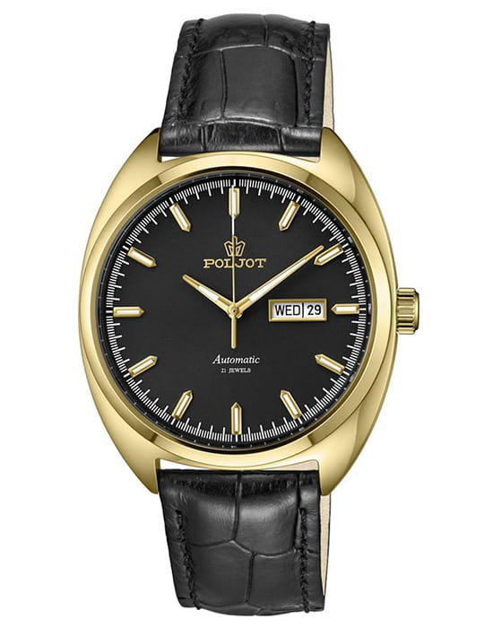 Poljot 8205.246275 — элегантные механические часы с автоподзаводом, сочетающем силу и изысканность. Корпус из нержавеющей стали с PVD-покрытиемPVDУльтратонкое покрытие наносится в технике вакуумного напыления, сочетает в себе нитрид титана особой прочности со слоем золота или оксида хрома. Несёт в себе декоративную или защитную функцию. подчеркивает надёжность и лаконичность дизайна, а глубокий циферблат с золотистыми стрелками придаёт модели благородный акцент. Проверенный японский механизм Miyota 8205 обеспечивает точность хода и долговечность, а плавное движение секундной стрелки подчёркивает качество сборки. Метки и стрелки с люминесцентным покрытиемЛюминесцентное покрытиеПозволяет считывать показания времени в темноте. Производители наносят на стрелки, часовые индексы, безель или поверхность циферблата светонакопительный состав, дающий холодное свечение. обеспечивают отличную читаемость при любом освещении, а окно даты добавляет практичности. Прочное минеральное стеклоМинеральное стеклоМинеральное стекло представляет собой искусственно выращенный минерал кварца. Такое стекло отличается особой устойчивостью к повреждениям и царапинам. Уступает по некоторым качествам сапфировому стеклу. защищает циферблат от царапин, а ремешок из натуральной кожи завершает утончённый облик модели. Poljot — гармония классики и современной механики, созданная для тех, кто ценит традиции и индивидуальность в каждой детали. В комплекте дополнительный ремешок с напульсником.