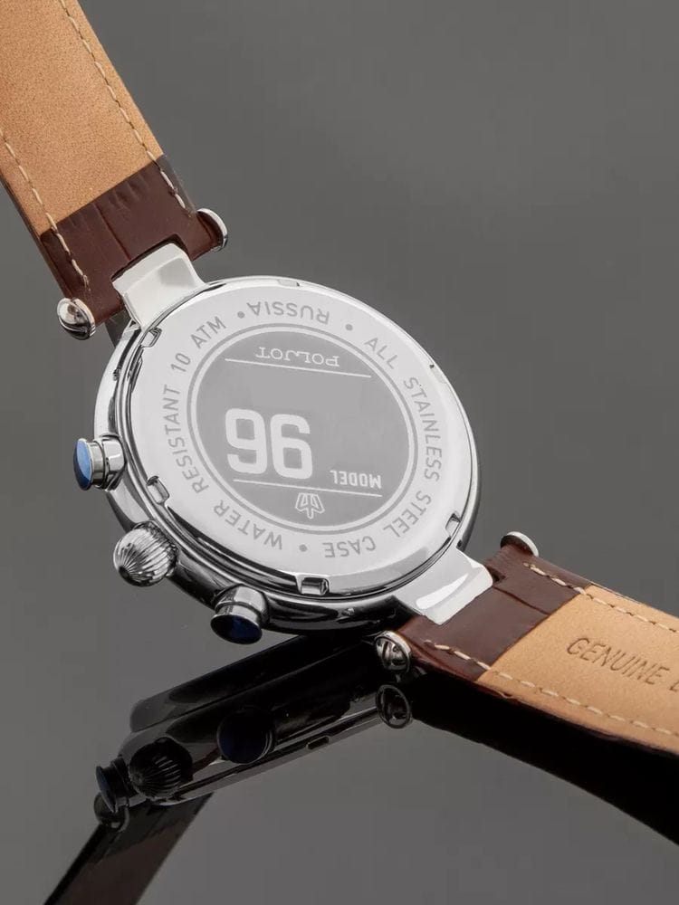 Poljot 6S21.961228 “Baikal” — элегантные кварцевые мужские часы, в которых классическая строгость сочетается с выразительным российским характером. Корпус из нержавеющей стали с крупными декоративными ушками придаёт модели солидность и узнаваемость, а глубокий циферблат с контрастными стрелками и индексами с люминесцентным покрытиемЛюминесцентное покрытиеПозволяет считывать показания времени в темноте. Производители наносят на стрелки, часовые индексы, безель или поверхность циферблата светонакопительный состав, дающий холодное свечение. подчёркивает точность и функциональность. Два дополнительных счётчика хронографаХронографФункция позволяет измерять отрезки времени с особой точностью: часы, минуты, секунды. Верным признаком хронографа является наличие на циферблате 3 дополнительных окошек-счётчиков. обеспечивают измерение времени с высокой точностью, а окно даты добавляет практичности. Прочное минеральное стеклоМинеральное стеклоМинеральное стекло представляет собой искусственно выращенный минерал кварца. Такое стекло отличается особой устойчивостью к повреждениям и царапинам. Уступает по некоторым качествам сапфировому стеклу. защищает циферблат от царапин, а ремешок из натуральной кожи с классической пряжкой гарантирует комфорт и надёжную фиксацию на запястье. Poljot “Baikal” — это сочетание традиций, надёжности и уверенного стиля, созданное для мужчин, ценящих точность и благородную сдержанность.