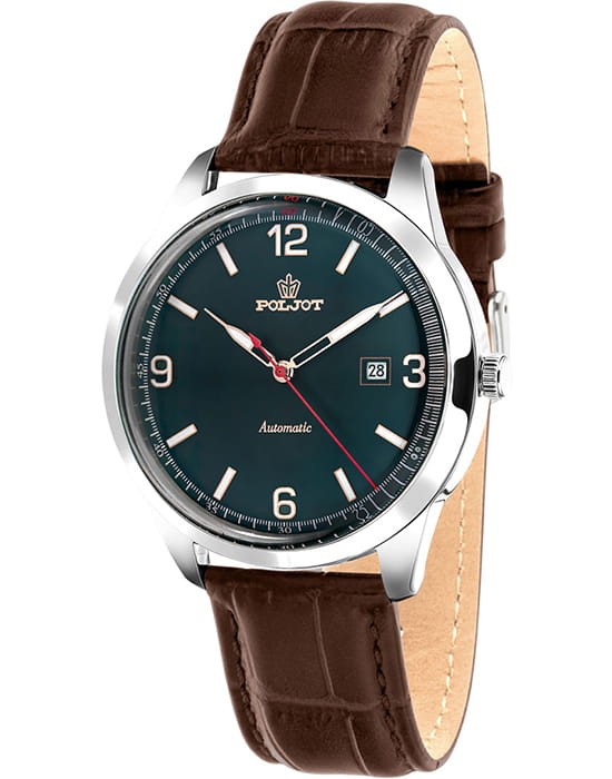 Poljot 8215.581020 — классические механические мужские часы с автоподзаводом, сочетающие традиции отечественного часового производства и лаконичный современный стиль. Корпус из нержавеющей стали подчёркивает надёжность и сдержанную элегантность модели, а глубокий циферблат с минималистичной разметкой, стрелки и метки с люминесцентным покрытиемЛюминесцентное покрытиеПозволяет считывать показания времени в темноте. Производители наносят на стрелки, часовые индексы, безель или поверхность циферблата светонакопительный состав, дающий холодное свечение., аккуратным окном даты и секундным акцентом придаёт образу динамичность. Механизм с автоподзаводом обеспечивает стабильную работу и плавный ход стрелок, подчёркивая инженерную точность исполнения. Прочное минеральное стеклоМинеральное стеклоМинеральное стекло представляет собой искусственно выращенный минерал кварца. Такое стекло отличается особой устойчивостью к повреждениям и царапинам. Уступает по некоторым качествам сапфировому стеклу. защищает циферблат, а ремешок из натуральной кожи с классической текстурой крокодила обеспечивает комфорт и благородный внешний вид. Poljot — воплощение надёжности, традиций и мужской элегантности, созданное для тех, кто ценит качество и уверенность в каждой детали.