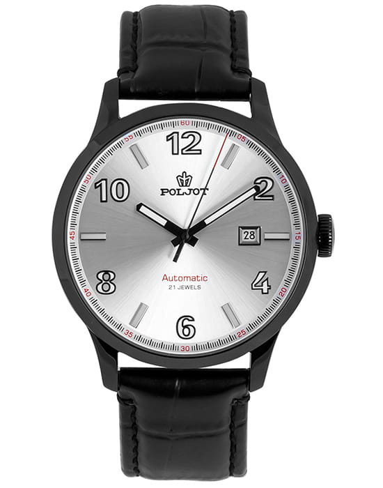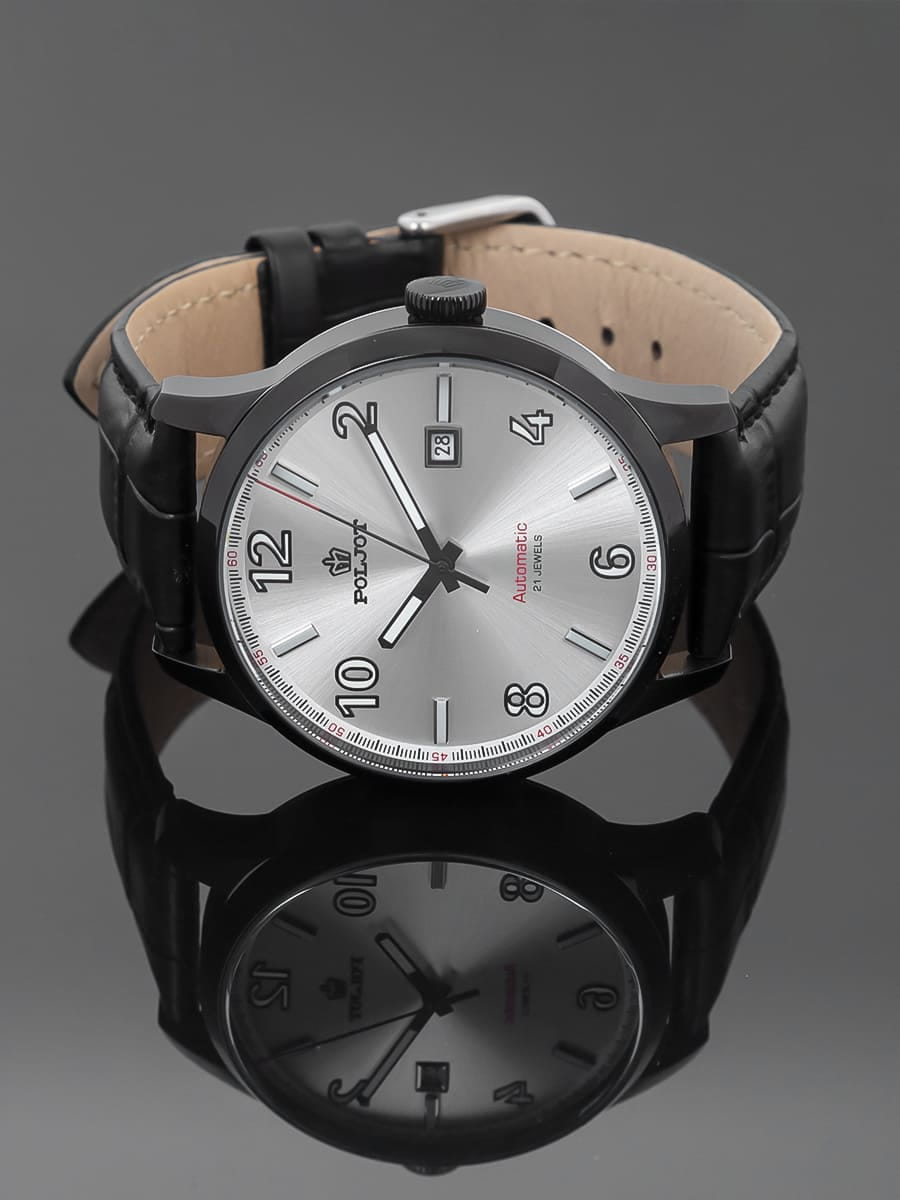 Poljot 8215.904221 — классические механические мужские часы с автоподзаводом, сочетающие сдержанный дизайн и надёжность российского часового производства. Корпус из нержавеющей стали с PVD-покрытиемPVDУльтратонкое покрытие наносится в технике вакуумного напыления, сочетает в себе нитрид титана особой прочности со слоем золота или оксида хрома. Несёт в себе декоративную или защитную функцию. подчёркивает строгость и универсальность модели, а циферблат с крупными арабскими цифрами и аккуратным окном даты на позиции «3 часов» обеспечивает превосходную читаемость. Стрелки и метки с люминесцентным покрытиемЛюминесцентное покрытиеПозволяет считывать показания времени в темноте. Производители наносят на стрелки, часовые индексы, безель или поверхность циферблата светонакопительный состав, дающий холодное свечение.. Механизм с автоподзаводом гарантирует стабильную работу и плавный ход стрелок. Прочное минеральное стеклоМинеральное стеклоМинеральное стекло представляет собой искусственно выращенный минерал кварца. Такое стекло отличается особой устойчивостью к повреждениям и царапинам. Уступает по некоторым качествам сапфировому стеклу. защищает циферблат от царапин, а ремешок из натуральной кожи придаёт часам современное и элегантное звучание. Poljot — это воплощение надёжности, классики и уверенного стиля, созданное для мужчин, предпочитающих традиционную механику и безупречный внешний вид.