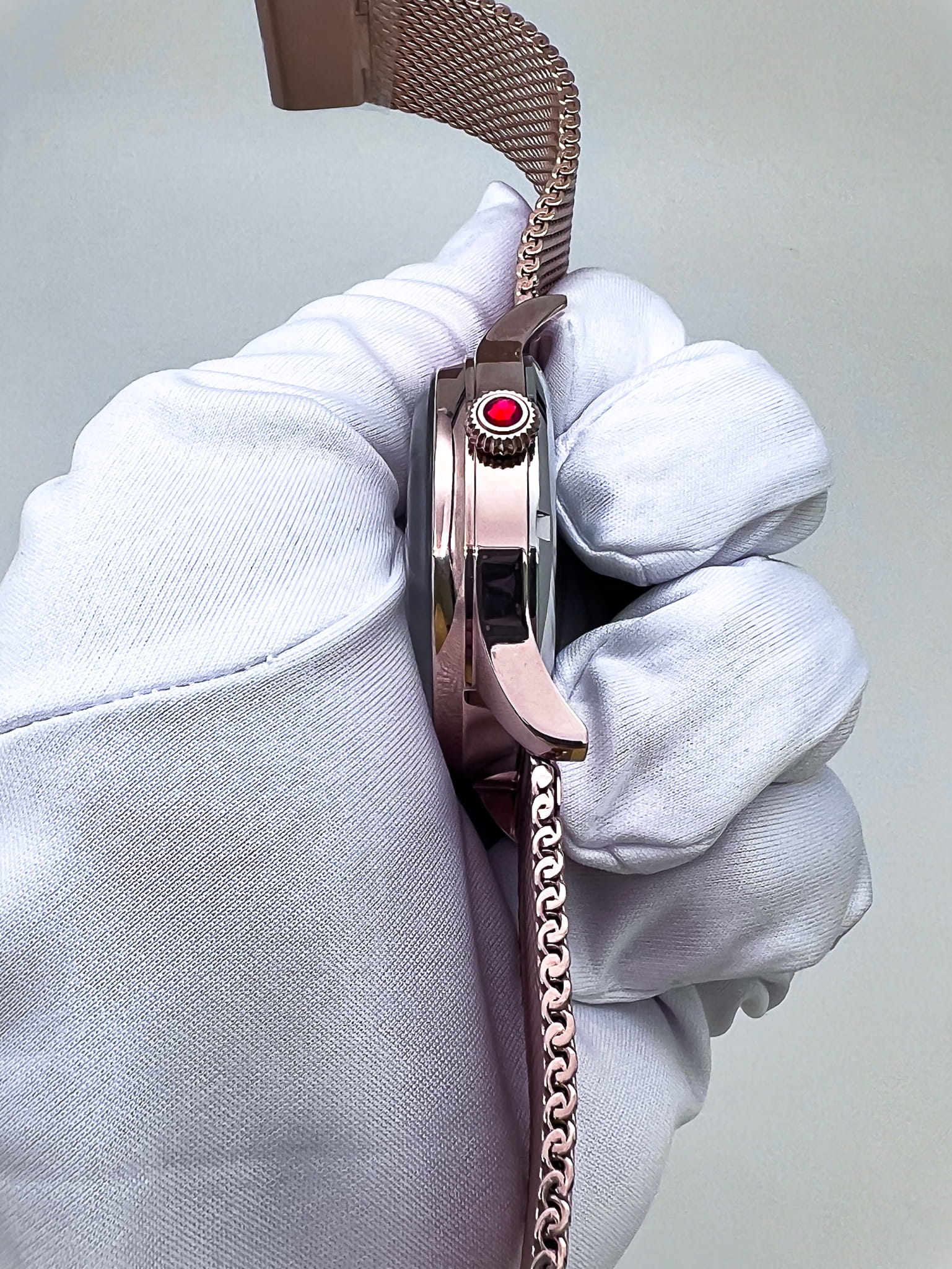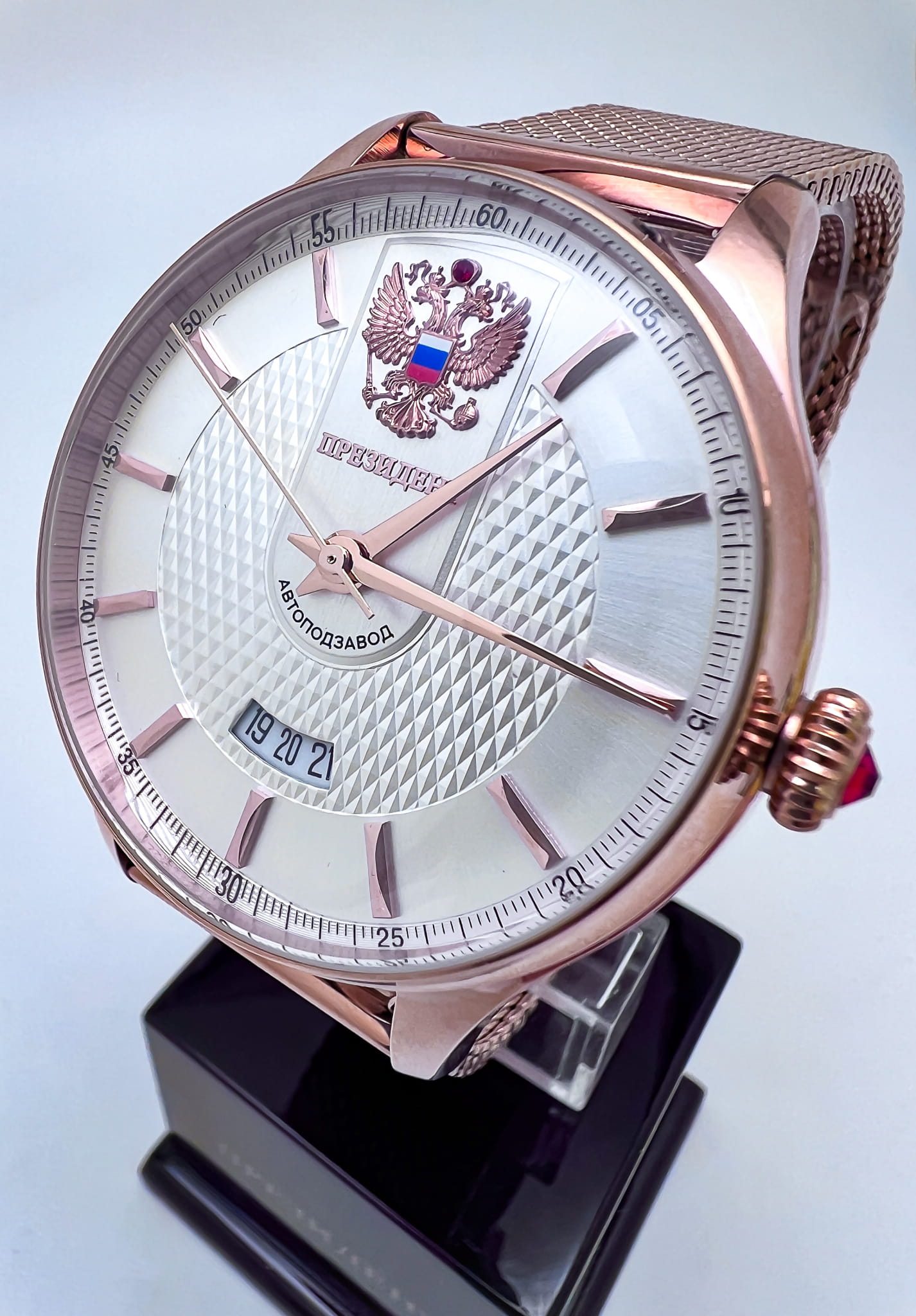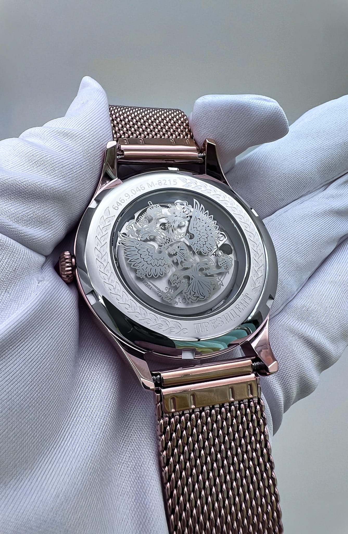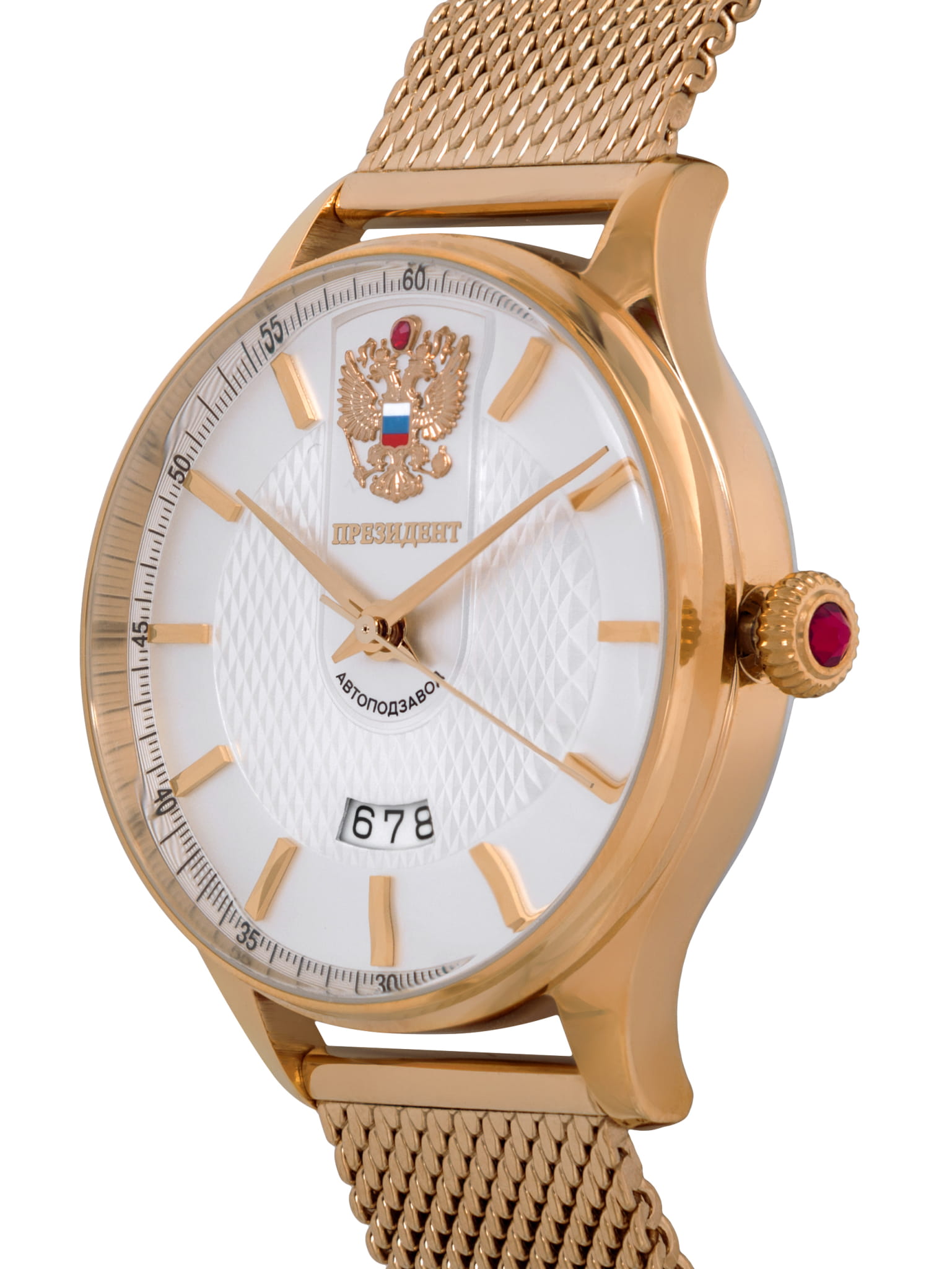 Часы «Президент» модели 6469046 — это мужские механические наручные часы с автоподзаводом, сочетающие изысканный дизайн и высокую функциональность. Механизм: японский механизм Miyota 8215 с автоподзаводом, обеспечивающий точность и долговечность. Функции: часы, минуты, секунды, дата. Корпус: из нержавеющей стали с PVD-покрытиемPVDУльтратонкое покрытие наносится в технике вакуумного напыления, сочетает в себе нитрид титана особой прочности со слоем золота или оксида хрома. Несёт в себе декоративную или защитную функцию., диаметром 42 мм. Циферблат: с изображением государственного герба России, подчёркивающий статусность модели. Стекло: минеральноеМинеральное стеклоМинеральное стекло представляет собой искусственно выращенный минерал кварца. Такое стекло отличается особой устойчивостью к повреждениям и царапинам. Уступает по некоторым качествам сапфировому стеклу., устойчивое к царапинам. Водонепроницаемость: 3 ATM (30 метров), защищает от случайных брызг и дождя. Стальной браслет миланского плетения на раскладном замкеРаскладной замокДанный вариант застежки используется только на часах с металлическим браслетом. Отличительная особенность такого крепления в том, что длина браслета становится универсальной и вы можете самостоятельно отрегулировать нужный вам размер – застежка просто двигается по браслету часов. с PVD-покрытиемPVDУльтратонкое покрытие наносится в технике вакуумного напыления, сочетает в себе нитрид титана особой прочности со слоем золота или оксида хрома. Несёт в себе декоративную или защитную функцию.. Эти часы идеально подойдут для деловых людей, ценящих стиль, надёжность и точность механического хода.