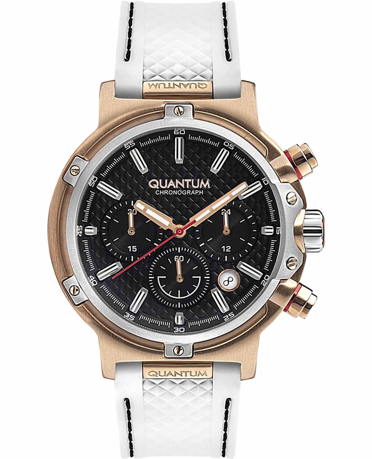 Мужские наручные часы-хронографХронографФункция позволяет измерять отрезки времени с особой точностью: часы, минуты, секунды. Верным признаком хронографа является наличие на циферблате 3 дополнительных окошек-счётчиков. Quantum HNG956.553, кварцевый механизм с высокой точностью. Минеральное стеклоМинеральное стеклоМинеральное стекло представляет собой искусственно выращенный минерал кварца. Такое стекло отличается особой устойчивостью к повреждениям и царапинам. Уступает по некоторым качествам сапфировому стеклу. устойчивое к появлению царапин, обладающее высокой прозрачностью. Класс водозащиты: 100 метров, позволит плавать, нырять и заниматься другими водными видами спорта. Стрелки с люминесцентным покрытиемЛюминесцентное покрытиеПозволяет считывать показания времени в темноте. Производители наносят на стрелки, часовые индексы, безель или поверхность циферблата светонакопительный состав, дающий холодное свечение.. Корпус часов изготовлен из нержавеющей стали с IP-покрытиемIP-покрытиеМетод ионного напыления. Демонстрирует повышенную устойчивость к истиранию, окислению и химическим веществам. Под воздействием высокого давления и температуры около 1500°C молекулы металла надёжно соединяются с частицами корпуса часов.. Силиконовый ремешок на стандартной застёжке. Окошко даты находится в положении между 4 и 5 часов.