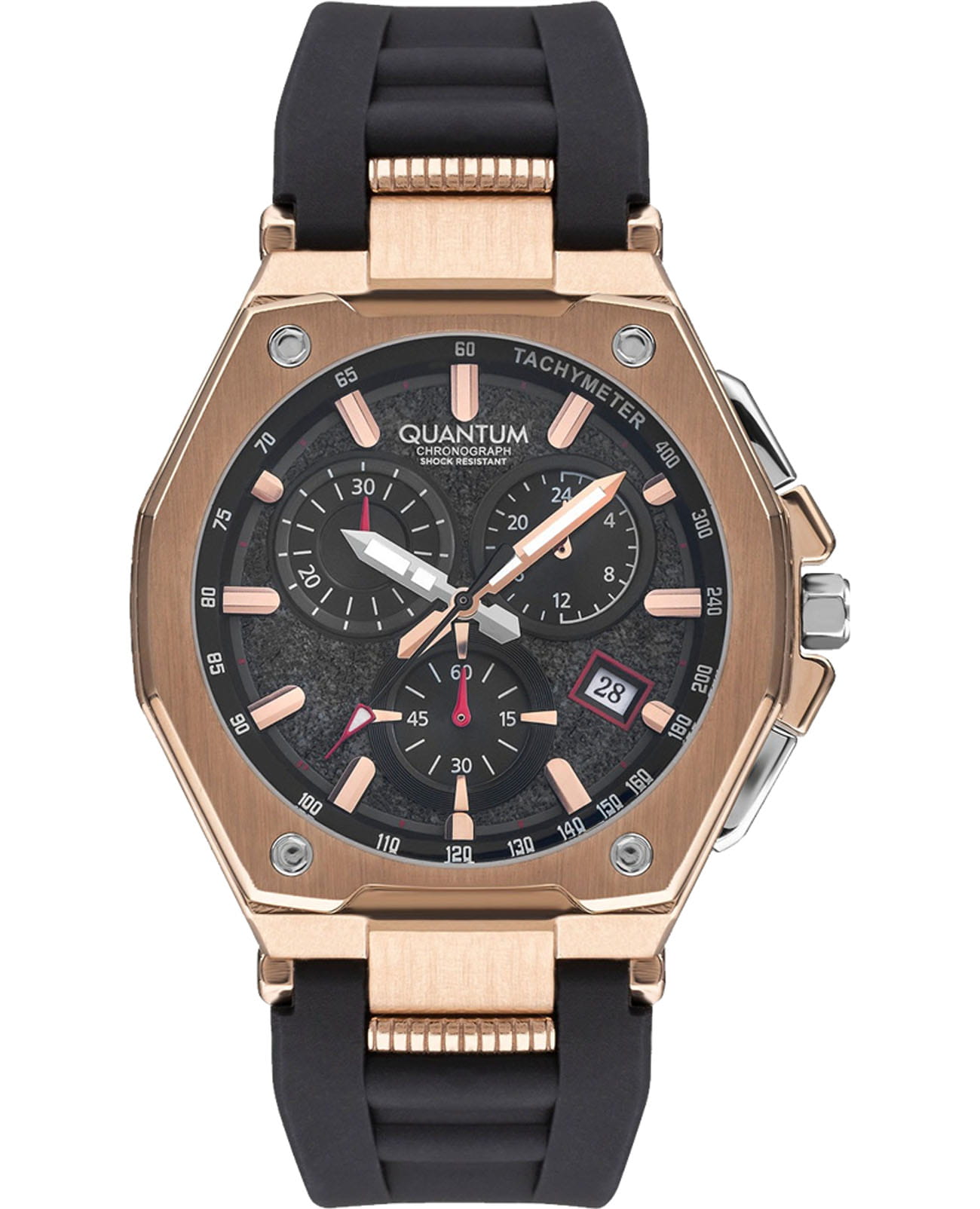 Мужские наручные часы-хронографХронографФункция позволяет измерять отрезки времени с особой точностью: часы, минуты, секунды. Верным признаком хронографа является наличие на циферблате 3 дополнительных окошек-счётчиков. Quantum PWG1005.451, кварцевый механизм с высокой точностью. Минеральное стеклоМинеральное стеклоМинеральное стекло представляет собой искусственно выращенный минерал кварца. Такое стекло отличается особой устойчивостью к повреждениям и царапинам. Уступает по некоторым качествам сапфировому стеклу. устойчивое к появлению царапин, обладающее высокой прозрачностью. Класс водозащиты: 100 метров, позволит плавать, нырять и заниматься другими водными видами спорта. Корпус часов изготовлен из нержавеющей стали с PVD-покрытиемPVDУльтратонкое покрытие наносится в технике вакуумного напыления, сочетает в себе нитрид титана особой прочности со слоем золота или оксида хрома. Несёт в себе декоративную или защитную функцию.. Стрелки и метки с люминесцентным покрытиемЛюминесцентное покрытиеПозволяет считывать показания времени в темноте. Производители наносят на стрелки, часовые индексы, безель или поверхность циферблата светонакопительный состав, дающий холодное свечение.. Браслет из каучука на стандартной застежке.