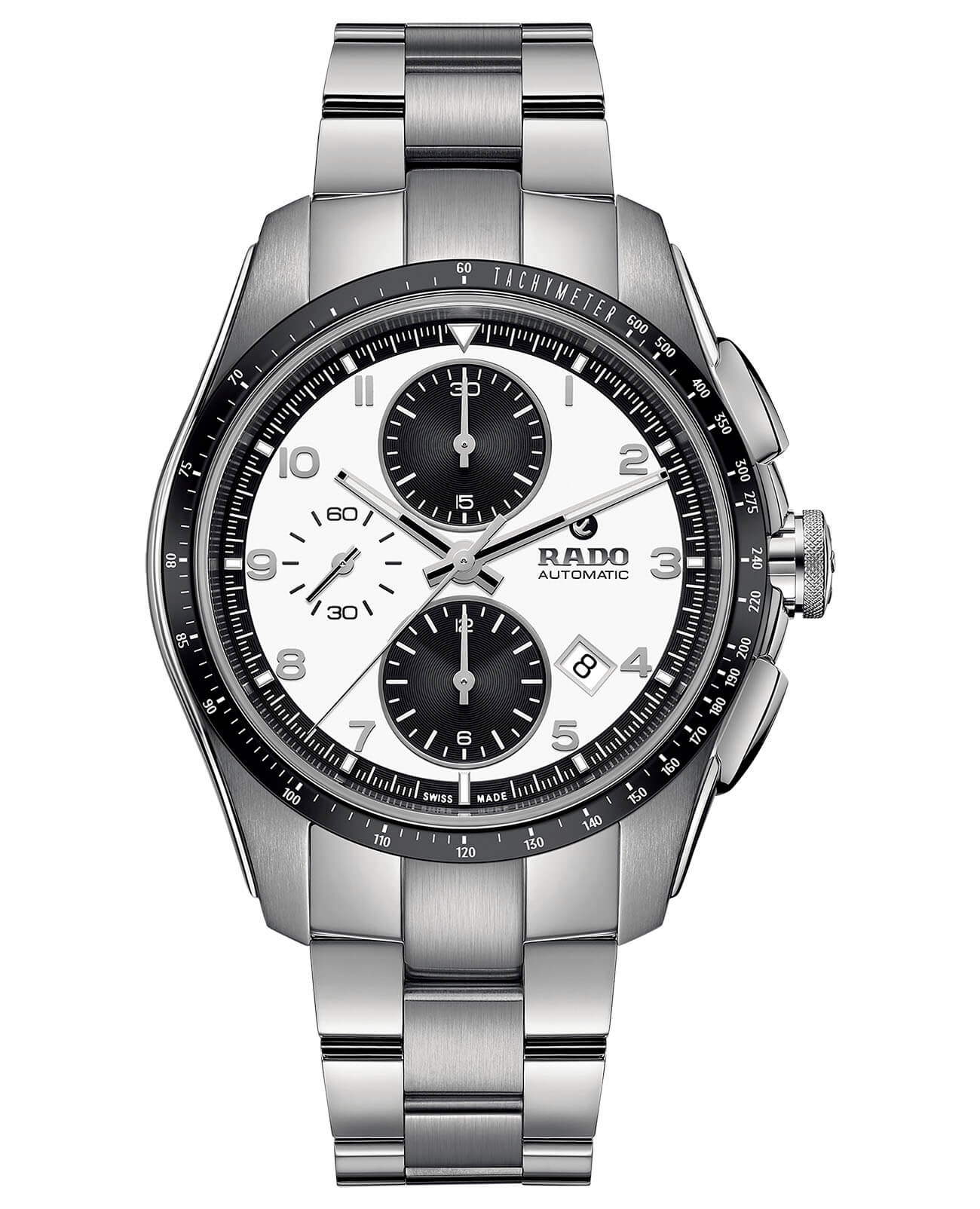 Классический хронографХронографФункция позволяет измерять отрезки времени с особой точностью: часы, минуты, секунды. Верным признаком хронографа является наличие на циферблате 3 дополнительных окошек-счётчиков. с элементами спортивного дизайна идеально подойдёт к образу солидного и делового мужчины. Винтажным элементом стал оригинальный дизайн «panda-style». Серебристо-чёрная расцветка позволяет носить часы при любых обстоятельствах. Модель оснащена швейцарским автоматическим механизмом ETA A05.H21, запас хода которого увеличен до 54 часов. Скелетонизированная задняя крышка корпуса. Стекло из сапфира с антибликовым покрытием. Корпус и браслет из стали 316L с антикоррозионными свойствами. Чёрный безельБезельВнешний ободок, закрепляющий стекло. В спортивных часах так называется поворотное кольцо с делениями на циферблате, выполняет роль таймера – замеряет отрезки времени на шкале. Неподвижный безель – элемент декора. Однонаправленно вращающийся безель на дайверских часах позволяет фиксировать моменты погружения и выныривания на поверхность. из высокотехнологичной керамикиВысокотехнологичная керамикаИнновационный запатентованный Rado материал с гладкой или матовой поверхностью. Керамика за счёт кристаллической структуры обладает повышенной устойчивостью от возникновения царапин. Материал способен принимать температуру тела человека, обеспечивая невероятный комфорт при ношении.. Люминесцентная подсветкаЛюминесцентное покрытиеПозволяет считывать показания времени в темноте. Производители наносят на стрелки, часовые индексы, безель или поверхность циферблата светонакопительный состав, дающий холодное свечение. стрелок. Водонепроницаемость 100 метров. Секундомер, отображение даты, шкала тахиметраТахиметрРазмеченная шкала, располагается на ободке или безеле часов. Тахиметр позволяет рассчитать скорость на определённом участке пути, расстояние измеряется в километрах или милях.. . Диаметр корпуса: 44 мм.