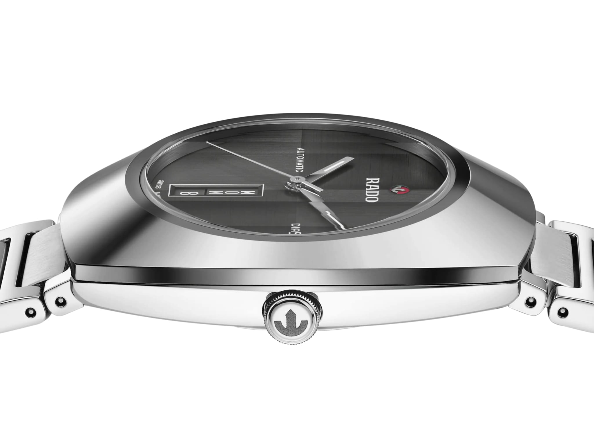 Уникальный DiaStar Original имеет диаметр 38 мм и водонепроницаемость до 100 м. Ceramos™CeramosМатериал являет собой инновационное сочетание высокотехнологичной керамики и сплава металла. Он объединяет керамическую устойчивость к царапинам и металлический роскошный блеск. с полированными углами и деталями, установленными поверх соответствующего монохромного корпуса из нержавеющей стали, эти красивые часы дополнены параллельным граненым сапфировым стекломСапфировое стеклоПрочный и надёжный материал из кристалла сапфира синтетического происхождения, характеризующийся особой твёрдостью и устойчивостью к царапинам и повреждениям.. Технические характеристики включают серый матовый циферблат с двумя направлениями, стрелки цвета родия с белым покрытием Super-LumiNova® и апертура даты на отметке 6 часов, соответствующий цвету циферблата. Внутри автоматический механизм Rado R764 с антимагнитным Nivachron™Nivachron™Специально разработанный инновационный сплав Nivachron™ повышает устойчивость часов к воздействию магнитных полей. обеспечивает 80 часов запаса хода. Браслет изготовлен из полированной и матовой нержавеющей стали.