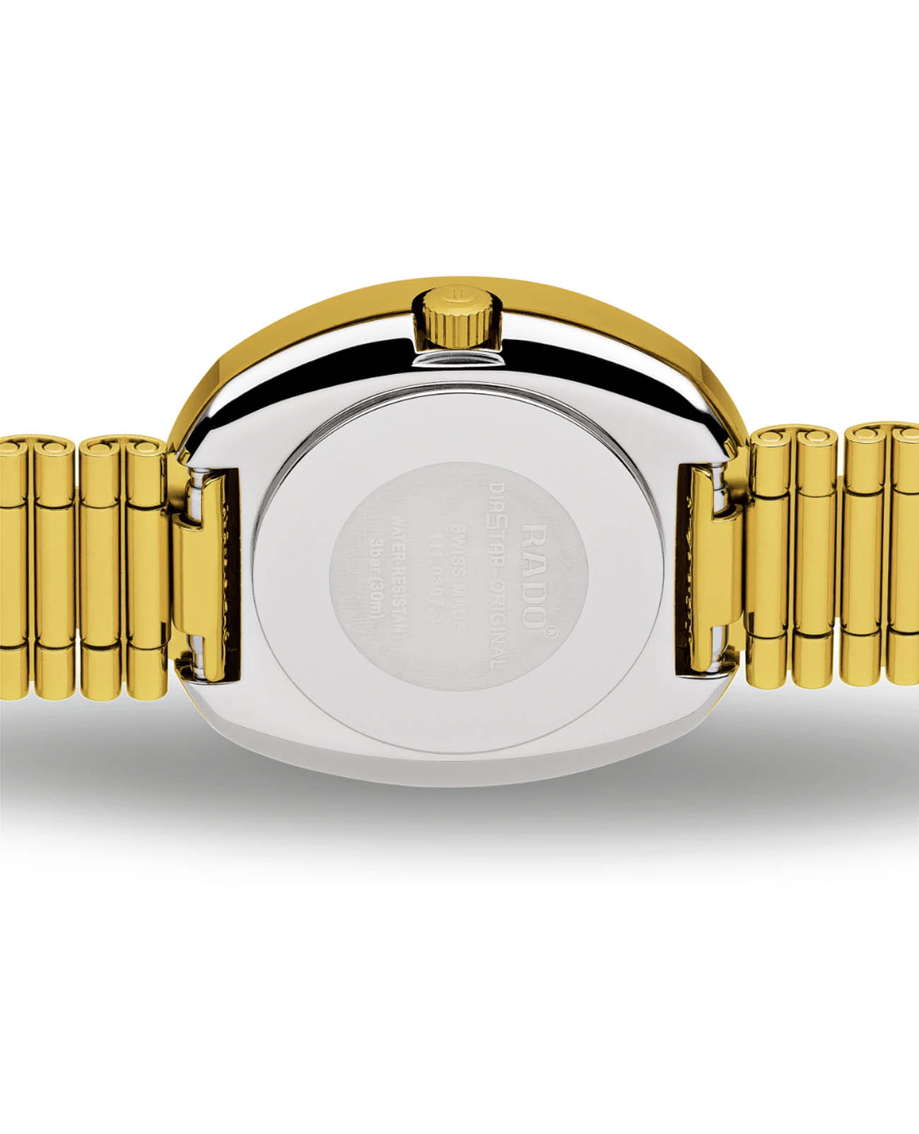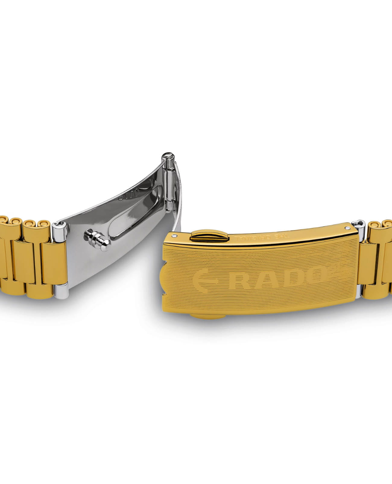 Женские часы Rado The Original Automatic R12416573 с надёжным автоматическим механизмом. Корпус и браслет часов выполнены из нержавеющей стали c PVD-покрытиемPVDУльтратонкое покрытие наносится в технике вакуумного напыления, сочетает в себе нитрид титана особой прочности со слоем золота или оксида хрома. Несёт в себе декоративную или защитную функцию.. Стальной браслет на раскладной застёжкеРаскладная застёжкаТакой тип застёжки используется только на браслетах из металла. Она никогда не раскрывается полностью, происходит разделение на 2 и более частей. Раскладывающая застёжка снизит вероятность потери часов к минимуму.. Класс водозащиты: 30 метров, позволит защитить корпус от случайных брызг или капель дождя. Окошко даты находится в положении 6 часов. Циферблат инкрустирован сапфирами. Стрелки и метки с люминесцентным покрытиемЛюминесцентное покрытиеПозволяет считывать показания времени в темноте. Производители наносят на стрелки, часовые индексы, безель или поверхность циферблата светонакопительный состав, дающий холодное свечение..