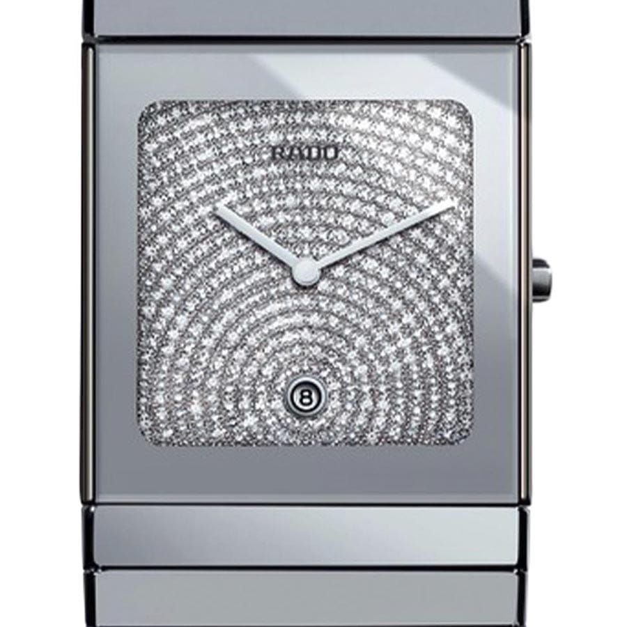 Швейцарские женские Rado Ceramica R21838302, кварцевый механизм с высокой точностью. Сапфировое стеклоСапфировое стеклоПрочный и надёжный материал из кристалла сапфира синтетического происхождения, характеризующийся особой твёрдостью и устойчивостью к царапинам и повреждениям. устойчивое к появлению царапин, обладающее высокой прозрачностью. Корпус часов изготовлен из нержавеющей стали и керамики. Класс водозащиты: 30 метров, позволит защитить корпус от случайных брызг или капель дождя. Керамический браслет на раскладной застёжкеРаскладная застёжкаТакой тип застёжки используется только на браслетах из металла. Она никогда не раскрывается полностью, происходит разделение на 2 и более частей. Раскладывающая застёжка снизит вероятность потери часов к минимуму.. Циферблат инкрустирован бриллиантами. Указатель даты на "6 часах". .
