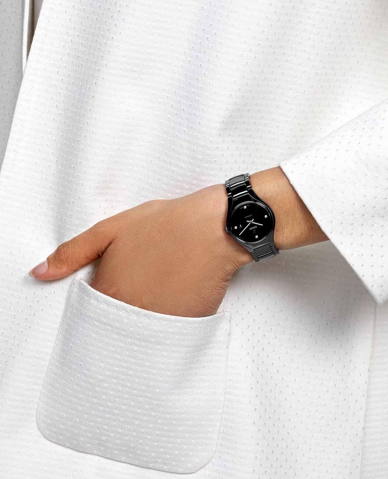 Швейцарские женские механические часы с автоподзаводом Rado True Automatic Diamonds R27242722. Сапфировое стеклоСапфировое стеклоПрочный и надёжный материал из кристалла сапфира синтетического происхождения, характеризующийся особой твёрдостью и устойчивостью к царапинам и повреждениям. устойчивое к появлению царапин, обладающее высокой прозрачностью. Корпус часов изготовлен из титана с PVD-покрытиемPVDУльтратонкое покрытие наносится в технике вакуумного напыления, сочетает в себе нитрид титана особой прочности со слоем золота или оксида хрома. Несёт в себе декоративную или защитную функцию. и высокотехнологичной керамикиВысокотехнологичная керамикаИнновационный запатентованный Rado материал с гладкой или матовой поверхностью. Керамика за счёт кристаллической структуры обладает повышенной устойчивостью от возникновения царапин. Материал способен принимать температуру тела человека, обеспечивая невероятный комфорт при ношении.. Циферблат украшен бриллиантами. Окошко даты находится в положении 3 часа. Класс водозащиты: 50 метров, позволит защитить корпус от случайных брызг или капель дождя. Браслет из высокотехнологичной керамикиВысокотехнологичная керамикаИнновационный запатентованный Rado материал с гладкой или матовой поверхностью. Керамика за счёт кристаллической структуры обладает повышенной устойчивостью от возникновения царапин. Материал способен принимать температуру тела человека, обеспечивая невероятный комфорт при ношении. на застёжке-бабочке с кнопкамиЗастёжка "бабочка"Такой вид застёжки дополняется предохранителями, помогающими избежать случайного раскрытия браслета. Обладают изящным исполнением. .