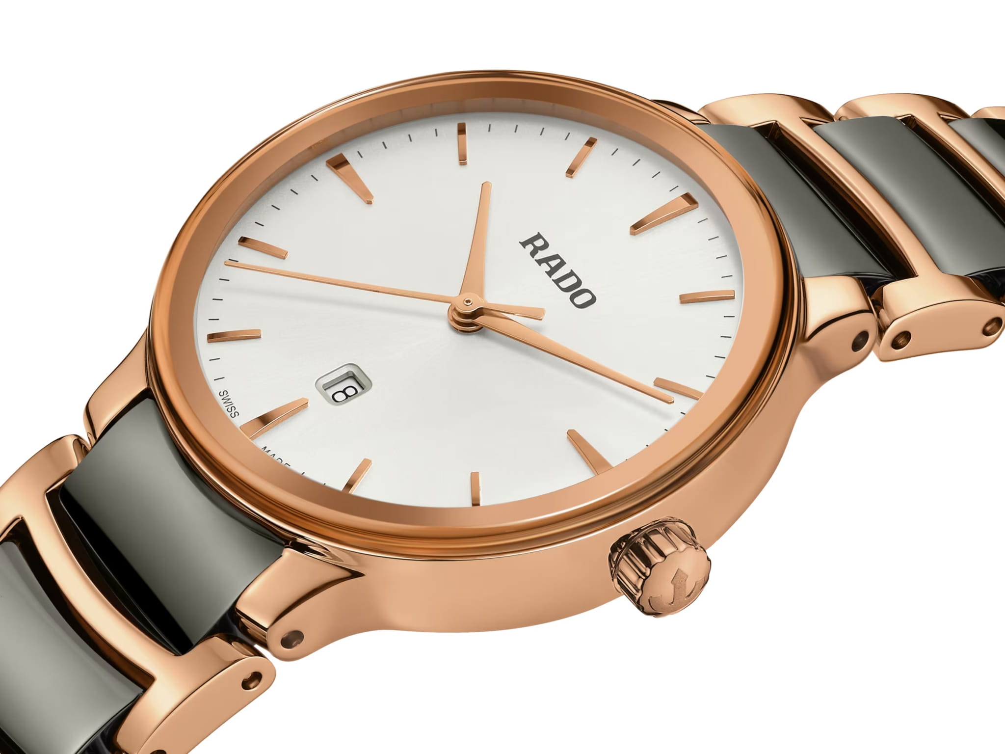 Швейцарские женские часы с надёжным кварцевым механизмом Rado Centrix R30024012. Корпус часов изготовлен из нержавеющей стали с PVD-покрытиемPVDУльтратонкое покрытие наносится в технике вакуумного напыления, сочетает в себе нитрид титана особой прочности со слоем золота или оксида хрома. Несёт в себе декоративную или защитную функцию.. Браслет из стали и высокотехнологичной керамикиВысокотехнологичная керамикаИнновационный запатентованный Rado материал с гладкой или матовой поверхностью. Керамика за счёт кристаллической структуры обладает повышенной устойчивостью от возникновения царапин. Материал способен принимать температуру тела человека, обеспечивая невероятный комфорт при ношении. на раскладной застёжкеРаскладная застёжкаТакой тип застёжки используется только на браслетах из металла. Она никогда не раскрывается полностью, происходит разделение на 2 и более частей. Раскладывающая застёжка снизит вероятность потери часов к минимуму.. Сапфировое стеклоСапфировое стеклоПрочный и надёжный материал из кристалла сапфира синтетического происхождения, характеризующийся особой твёрдостью и устойчивостью к царапинам и повреждениям. устойчивое к мелким механическим повреждениям. Класс водозащиты: 50 метров, позволит защитить корпус от случайных брызг или капель дождя. Окошко даты находится в положении 6 часов.