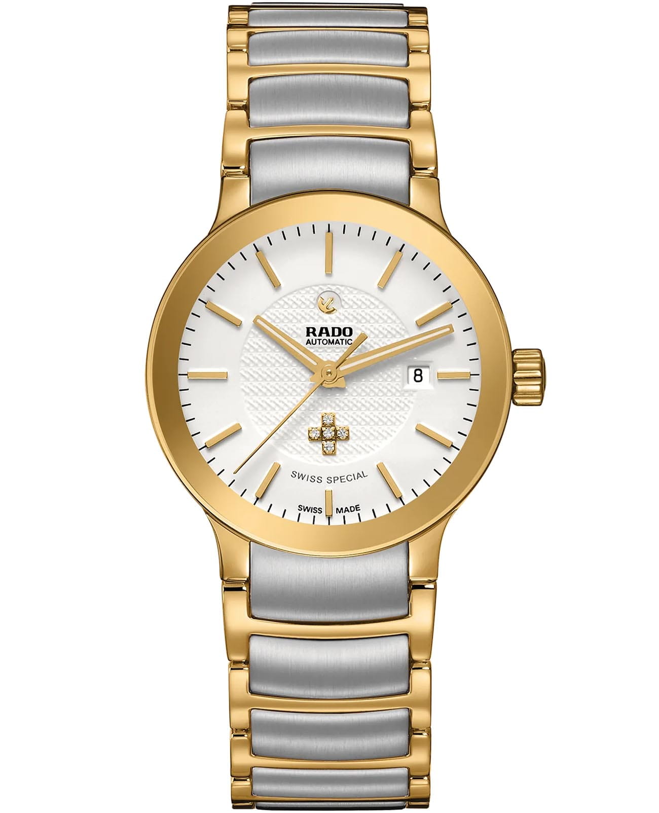 Женские швейцарские часы с автоподзаводом Rado Centrix Automatic Diamonds R30080703. Сапфировое стеклоСапфировое стеклоПрочный и надёжный материал из кристалла сапфира синтетического происхождения, характеризующийся особой твёрдостью и устойчивостью к царапинам и повреждениям. устойчивое к мелким механическим повреждениям. Стальной браслет на раскладной застёжкеРаскладная застёжкаТакой тип застёжки используется только на браслетах из металла. Она никогда не раскрывается полностью, происходит разделение на 2 и более частей. Раскладывающая застёжка снизит вероятность потери часов к минимуму.. Корпус и браслет часов изготовлены из нержавеющей стали с PVD-покрытиемPVDУльтратонкое покрытие наносится в технике вакуумного напыления, сочетает в себе нитрид титана особой прочности со слоем золота или оксида хрома. Несёт в себе декоративную или защитную функцию.. Окошко даты находится в положении 3 часа. Циферблат инкрустирован бриллиантами. Класс водозащиты: 30 метров, позволит защитить корпус от случайных брызг или капель дождя. Стрелки с люминесцентным покрытиемЛюминесцентное покрытиеПозволяет считывать показания времени в темноте. Производители наносят на стрелки, часовые индексы, безель или поверхность циферблата светонакопительный состав, дающий холодное свечение..