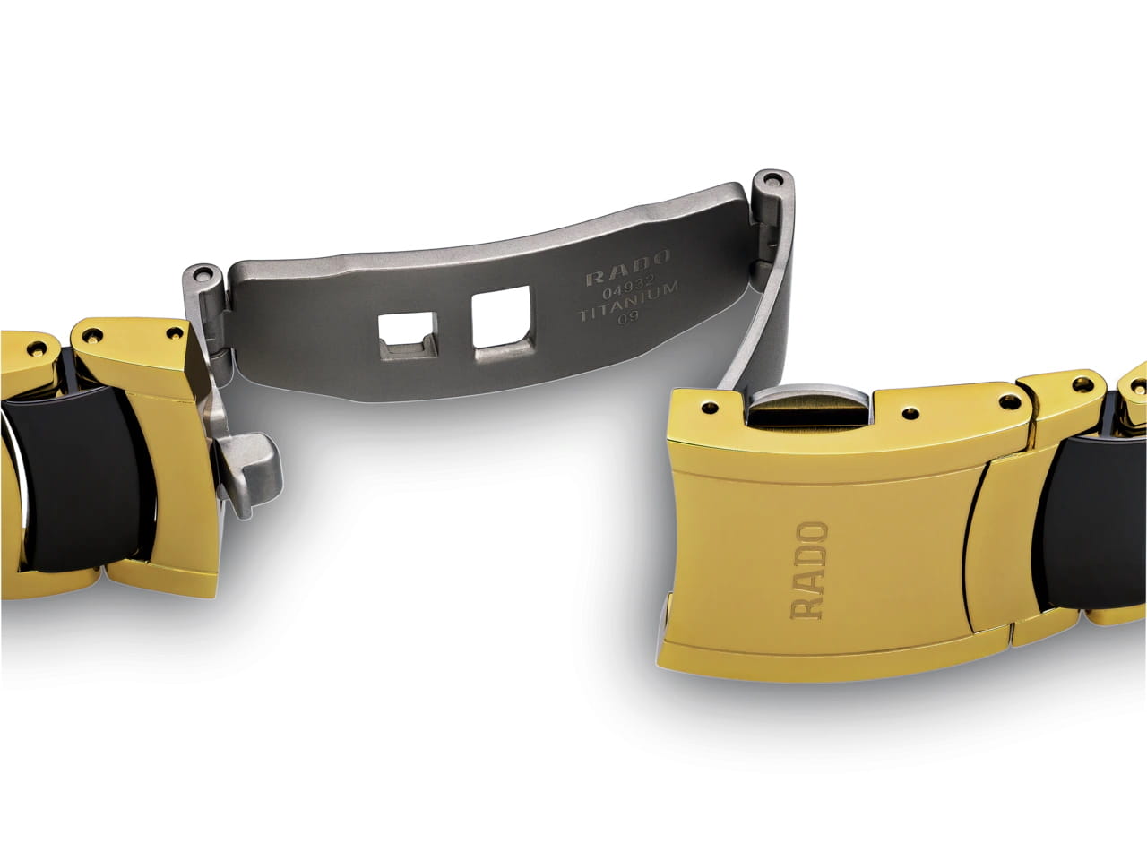 Аксессуар являет собой сочетание классической красоты и современного дизайна, отражающего минимализм. Его безупречная работа обеспечивается за счёт швейцарского автоматического механизма ETA 2671 с 38-часовым запасом хода. Прозрачная задняя крышка позволяет прикоснуться к часовому искусству и понаблюдать за движением деталей. Сапфировое стекло. Инкрустация 12 бриллиантами в 0,025 карат. Браслет из стали 316L с золотистым PVD-покрытиемPVDУльтратонкое покрытие наносится в технике вакуумного напыления, сочетает в себе нитрид титана особой прочности со слоем золота или оксида хрома. Несёт в себе декоративную или защитную функцию. и высокотехнологичной керамикиВысокотехнологичная керамикаИнновационный запатентованный Rado материал с гладкой или матовой поверхностью. Керамика за счёт кристаллической структуры обладает повышенной устойчивостью от возникновения царапин. Материал способен принимать температуру тела человека, обеспечивая невероятный комфорт при ношении.. Водонепроницаемость 30 метров. . Окошко даты. Диаметр корпуса: 28 мм.