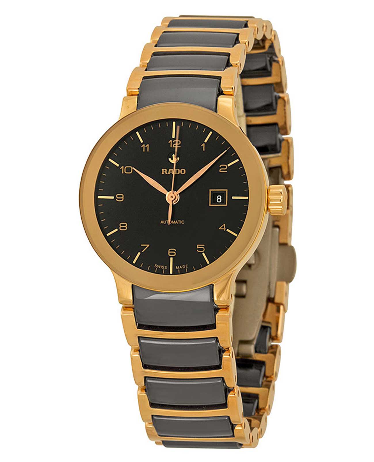 Швейцарские женские механические часы с автоподзаводом Rado Centrix Diamonds R30954152. Сапфировое стеклоСапфировое стеклоПрочный и надёжный материал из кристалла сапфира синтетического происхождения, характеризующийся особой твёрдостью и устойчивостью к царапинам и повреждениям. устойчивое к появлению царапин, обладающее высокой прозрачностью. Корпус часов изготовлен из нержавеющей стали с PVD-покрытиемPVDУльтратонкое покрытие наносится в технике вакуумного напыления, сочетает в себе нитрид титана особой прочности со слоем золота или оксида хрома. Несёт в себе декоративную или защитную функцию.. Окошко даты находится в положении 3 часа. Класс водозащиты: 30 метров, позволит защитить корпус от случайных брызг или капель дождя. Браслет из высокотехнологичной керамикиВысокотехнологичная керамикаИнновационный запатентованный Rado материал с гладкой или матовой поверхностью. Керамика за счёт кристаллической структуры обладает повышенной устойчивостью от возникновения царапин. Материал способен принимать температуру тела человека, обеспечивая невероятный комфорт при ношении. и нержавеющей стали с PVD-покрытиемPVDУльтратонкое покрытие наносится в технике вакуумного напыления, сочетает в себе нитрид титана особой прочности со слоем золота или оксида хрома. Несёт в себе декоративную или защитную функцию. на раскладной застёжкеРаскладная застёжкаТакой тип застёжки используется только на браслетах из металла. Она никогда не раскрывается полностью, происходит разделение на 2 и более частей. Раскладывающая застёжка снизит вероятность потери часов к минимуму..
