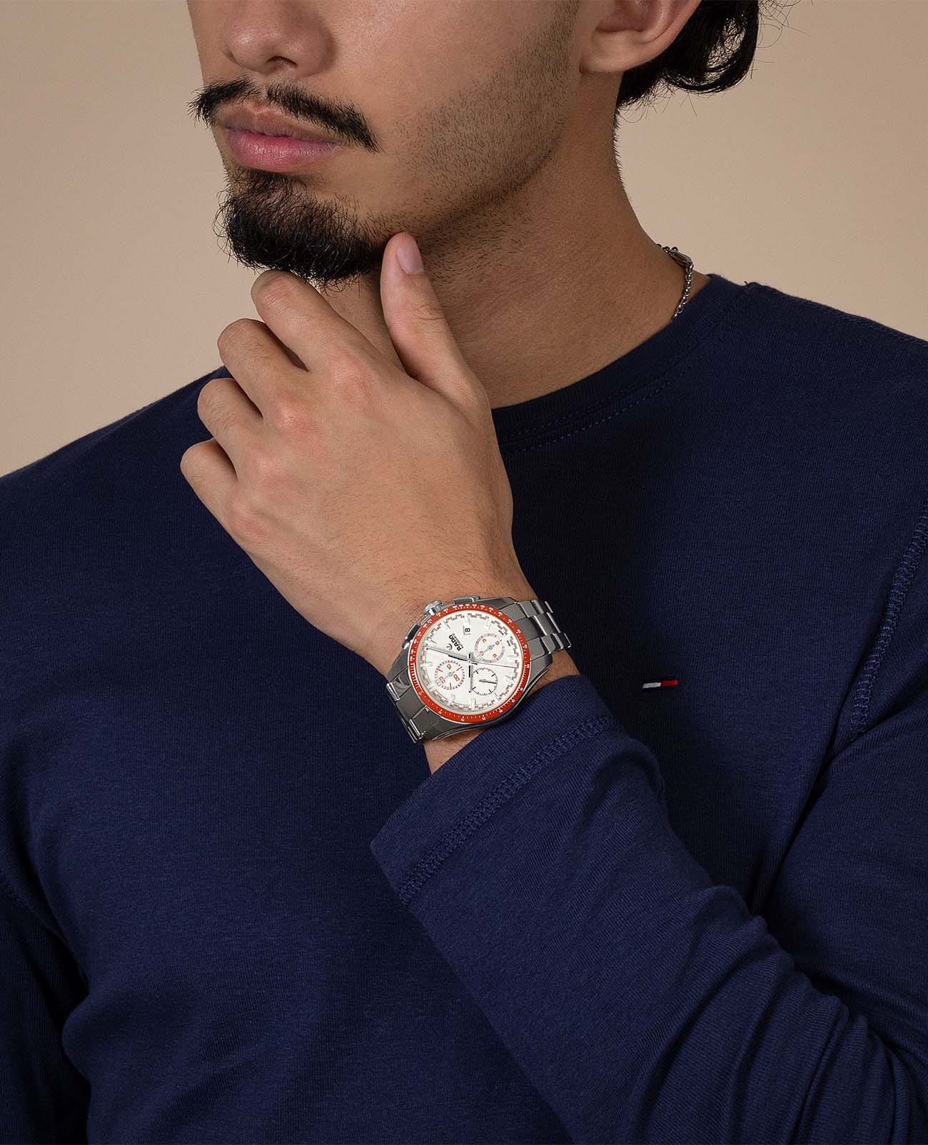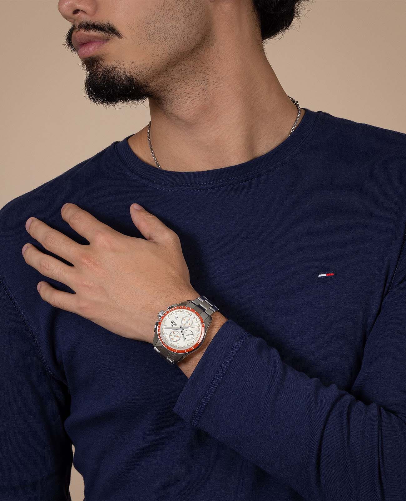 Мужские механические часы с автоподзаводом Rado HyperChrome — это динамичный и элегантный аксессуар, сочетающий спортивный стиль и швейцарское качество. Корпус диаметром 44 мм и толщиной 15,1 мм выполнен из нержавеющей стали и керамики. Циферблат белого цвета оформлен субциферблатами хронографа и индексами. Циферблат защищён сапфировым стекломСапфировое стеклоПрочный и надёжный материал из кристалла сапфира синтетического происхождения, характеризующийся особой твёрдостью и устойчивостью к царапинам и повреждениям.. Механизм — автоматический с запасом хода 65 часов. Часы оснащены функциями хронографаХронографФункция позволяет измерять отрезки времени с особой точностью: часы, минуты, секунды. Верным признаком хронографа является наличие на циферблате 3 дополнительных окошек-счётчиков., отображения часов, минут, секунд и даты. БезельБезельВнешний ободок, закрепляющий стекло. В спортивных часах так называется поворотное кольцо с делениями на циферблате, выполняет роль таймера – замеряет отрезки времени на шкале. Неподвижный безель – элемент декора. Однонаправленно вращающийся безель на дайверских часах позволяет фиксировать моменты погружения и выныривания на поверхность. — стальной, с элементами керамики. Часы оснащены стальным браслетом на раскладной застёжкеРаскладная застёжкаТакой тип застёжки используется только на браслетах из металла. Она никогда не раскрывается полностью, происходит разделение на 2 и более частей. Раскладывающая застёжка снизит вероятность потери часов к минимуму.. Водонепроницаемость 100 м позволяет использовать часы для плавания и повседневного ношения. Идеальный выбор для тех, кто ценит точность, стиль и универсальность.