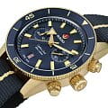 Хронограф Капитана Кука имеет характерное, устойчивое к царапинам Сапфировое стеклоСапфировое стеклоПрочный и надёжный материал из кристалла сапфира синтетического происхождения, характеризующийся особой твёрдостью и устойчивостью к царапинам и повреждениям. с антибликовым покрытием на обеих сторонах. Тонкий стильный корпус диаметром 43 мм из матовой бронзы имеет полированную синюю высокотехнологичную керамическую вставку на безелеБезельВнешний ободок, закрепляющий стекло. В спортивных часах так называется поворотное кольцо с делениями на циферблате, выполняет роль таймера – замеряет отрезки времени на шкале. Неподвижный безель – элемент декора. Однонаправленно вращающийся безель на дайверских часах позволяет фиксировать моменты погружения и выныривания на поверхность., дополняющую голубой циферблат Sunray. На цифры, маркеры и стрелочки нанесено люминесцентное покрытиеЛюминесцентное покрытиеПозволяет считывать показания времени в темноте. Производители наносят на стрелки, часовые индексы, безель или поверхность циферблата светонакопительный состав, дающий холодное свечение. Super-LumiNova®. Внутри новый, более тонкий автоматический механизм R801 с 37 камнями, пятью стрелками и 59 часами запаса хода благодаря антимагнитной пружине Nivachron™Nivachron™Специально разработанный инновационный сплав Nivachron™ повышает устойчивость часов к воздействию магнитных полей., превосходит стандартные требования к испытаниям с 3 до 5 положений для более высокой точности. Модель поставляется с тканевым ремешком с золотистой полосой по центру, а также синим кожаным ремешком и дополнительным тканевым ремешком темно-синего цвета.