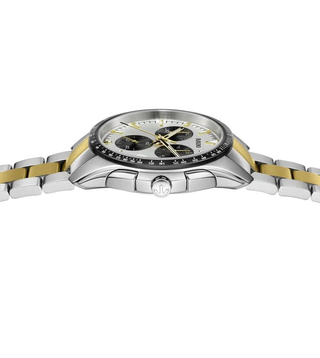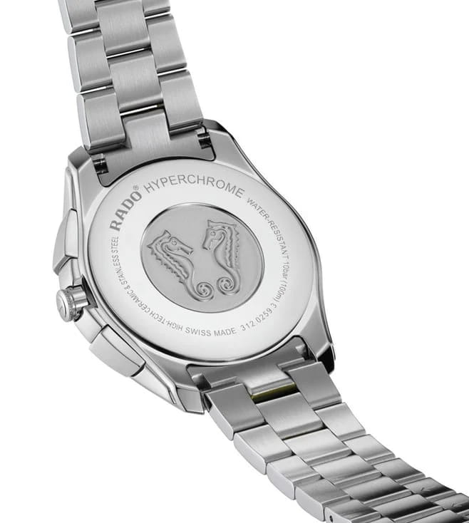 Мужские наручные часы-хронографХронографФункция позволяет измерять отрезки времени с особой точностью: часы, минуты, секунды. Верным признаком хронографа является наличие на циферблате 3 дополнительных окошек-счётчиков. Rado Hyperchrome Chronograph. Корпус часов изготовлен из нержавеющей стали. БезельБезельВнешний ободок, закрепляющий стекло. В спортивных часах так называется поворотное кольцо с делениями на циферблате, выполняет роль таймера – замеряет отрезки времени на шкале. Неподвижный безель – элемент декора. Однонаправленно вращающийся безель на дайверских часах позволяет фиксировать моменты погружения и выныривания на поверхность. из нержавеющей стали с PVD-покрытиемPVDУльтратонкое покрытие наносится в технике вакуумного напыления, сочетает в себе нитрид титана особой прочности со слоем золота или оксида хрома. Несёт в себе декоративную или защитную функцию.. Стальной браслет с частичным PVD-покрытиемPVDУльтратонкое покрытие наносится в технике вакуумного напыления, сочетает в себе нитрид титана особой прочности со слоем золота или оксида хрома. Несёт в себе декоративную или защитную функцию. на застёжке «бабочка» с кнопкамиЗастёжка "бабочка"Такой вид застёжки дополняется предохранителями, помогающими избежать случайного раскрытия браслета. Обладают изящным исполнением. . БезельБезельВнешний ободок, закрепляющий стекло. В спортивных часах так называется поворотное кольцо с делениями на циферблате, выполняет роль таймера – замеряет отрезки времени на шкале. Неподвижный безель – элемент декора. Однонаправленно вращающийся безель на дайверских часах позволяет фиксировать моменты погружения и выныривания на поверхность. со шкалой тахиметраТахиметрРазмеченная шкала, располагается на ободке или безеле часов. Тахиметр позволяет рассчитать скорость на определённом участке пути, расстояние измеряется в километрах или милях.. Окошко даты находится в положении 4 часа. Стрелки и метки с люминесцентным покрытиемЛюминесцентное покрытиеПозволяет считывать показания времени в темноте. Производители наносят на стрелки, часовые индексы, безель или поверхность циферблата светонакопительный состав, дающий холодное свечение.. Сапфировое стеклоСапфировое стеклоПрочный и надёжный материал из кристалла сапфира синтетического происхождения, характеризующийся особой твёрдостью и устойчивостью к царапинам и повреждениям. с антибликовым покрытиемАнтибликовое покрытиеСлой оксида металла в 0,13-0,3 микрон, благодаря которому стекло часов не бликует и не отражает свет. Антибликовое покрытие уменьшает отражение света в 10 раз, обеспечивая отличную читаемость показателей циферблата. устойчивое к мелким механическим повреждениям. Класс водозащиты: 100 метров, позволит плавать, нырять и заниматься другими водными видами спорта.