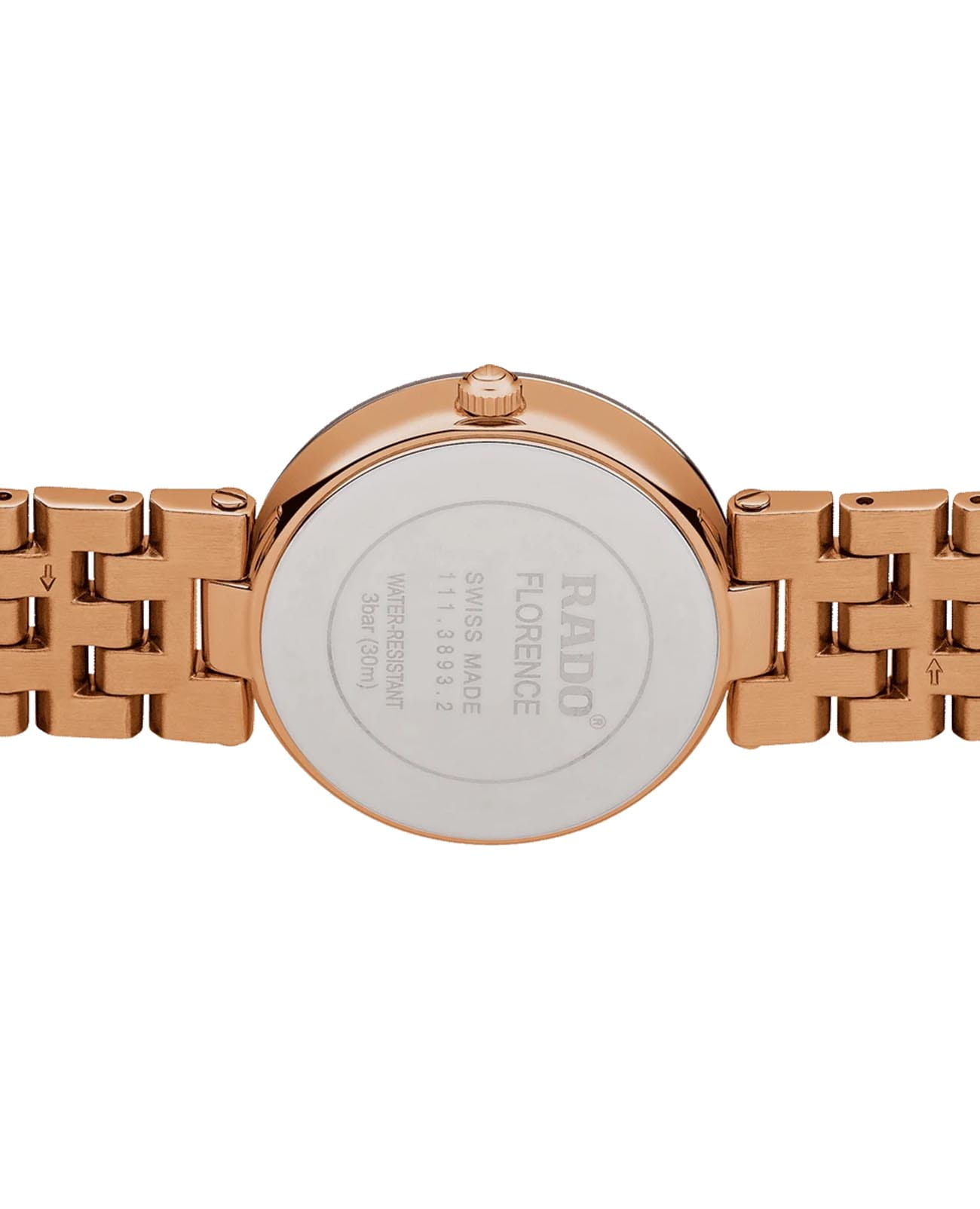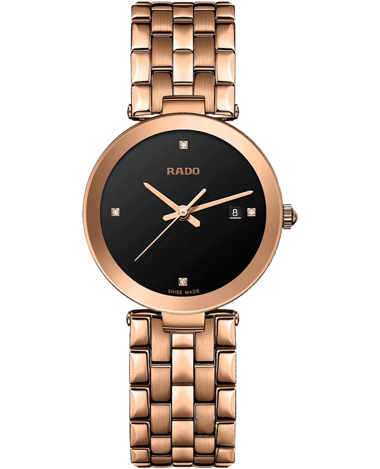Женские швейцарские кварцевые часы Rado Florence R48893713. Сапфировое стеклоСапфировое стеклоПрочный и надёжный материал из кристалла сапфира синтетического происхождения, характеризующийся особой твёрдостью и устойчивостью к царапинам и повреждениям. устойчивое к мелким механическим повреждениям. Стальной браслет на застёжке-бабочке. Корпус и браслет часов изготовлены из нержавеющей стали с PVD-покрытиемPVDУльтратонкое покрытие наносится в технике вакуумного напыления, сочетает в себе нитрид титана особой прочности со слоем золота или оксида хрома. Несёт в себе декоративную или защитную функцию.. Окошко даты находится в положении 3 часа. Класс водозащиты: 30 метров, позволит защитить корпус от случайных брызг или капель дождя. Циферблат инкрустирован бриллиантами.