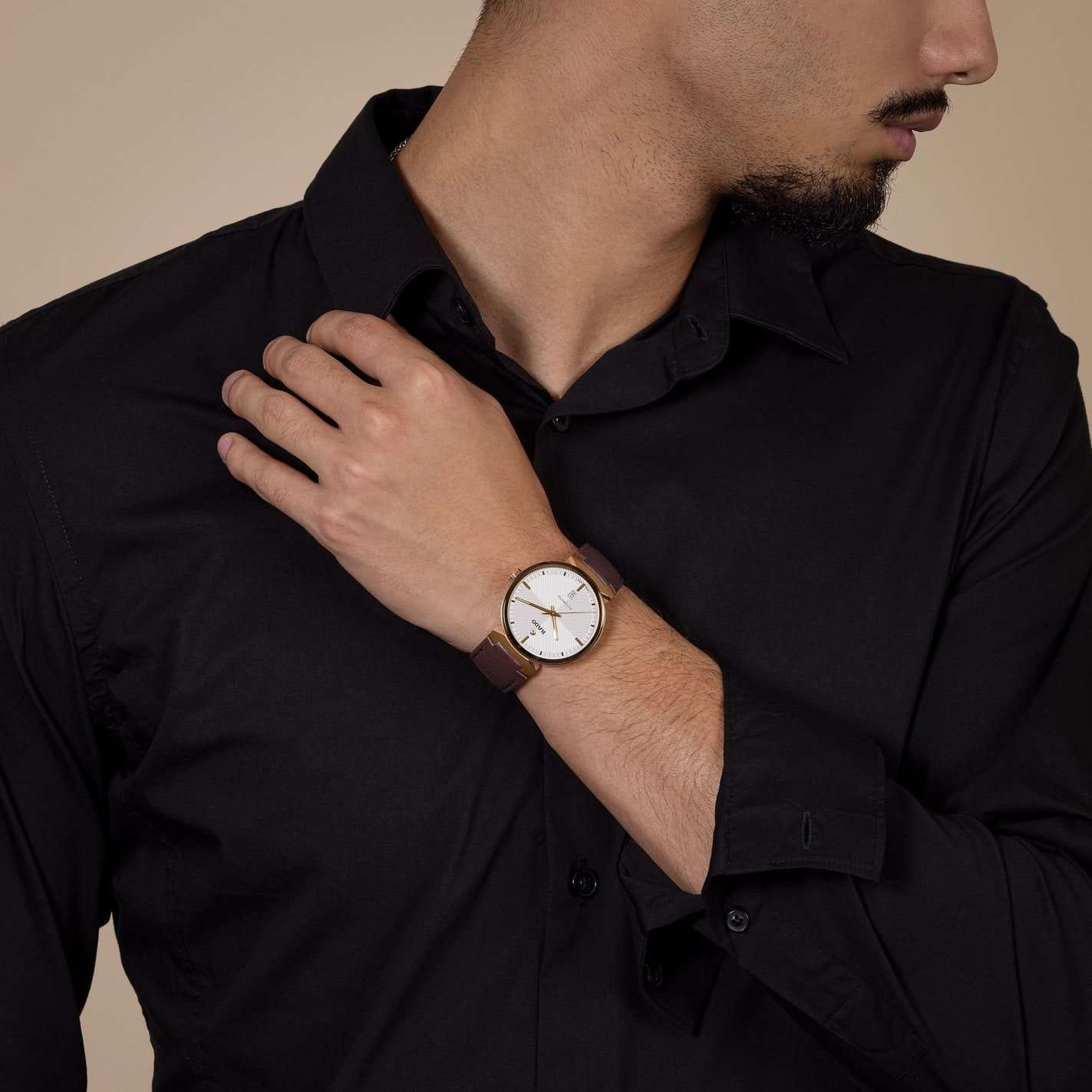 Универсальные механические часы с автоподзаводом Rado из коллекции Florence — это воплощение швейцарской точности и элегантности. Корпус диаметром 39 мм и толщиной 11 мм выполнен из нержавеющей стали с PVD-покрытиемPVDУльтратонкое покрытие наносится в технике вакуумного напыления, сочетает в себе нитрид титана особой прочности со слоем золота или оксида хрома. Несёт в себе декоративную или защитную функцию. розового золота. Циферблат бежевого цвета с рельефным узором оформлен накладными индексами и подвижным якорем бренда — символом Rado. Циферблат защищён сапфировым стекломСапфировое стеклоПрочный и надёжный материал из кристалла сапфира синтетического происхождения, характеризующийся особой твёрдостью и устойчивостью к царапинам и повреждениям. с антибликовым покрытиемАнтибликовое покрытиеСлой оксида металла в 0,13-0,3 микрон, благодаря которому стекло часов не бликует и не отражает свет. Антибликовое покрытие уменьшает отражение света в 10 раз, обеспечивая отличную читаемость показателей циферблата., которое одновременно выполняет функцию безеляБезельВнешний ободок, закрепляющий стекло. В спортивных часах так называется поворотное кольцо с делениями на циферблате, выполняет роль таймера – замеряет отрезки времени на шкале. Неподвижный безель – элемент декора. Однонаправленно вращающийся безель на дайверских часах позволяет фиксировать моменты погружения и выныривания на поверхность.. Механизм — автоматический калибр R763 с пружиной Nivachron™Nivachron™Специально разработанный инновационный сплав Nivachron™ повышает устойчивость часов к воздействию магнитных полей., отрегулированный в пяти положениях, с запасом хода 80 часов. Окошко даты расположено в положении 3 часов. Завинчивающаяся коронка обеспечивает дополнительную защиту. Часы оснащены кожаным ремешком коричневого цвета и пряжкой из нержавеющей стали с PVD-покрытиемPVDУльтратонкое покрытие наносится в технике вакуумного напыления, сочетает в себе нитрид титана особой прочности со слоем золота или оксида хрома. Несёт в себе декоративную или защитную функцию. розового золота. Водонепроницаемость 50 м позволяет использовать часы в повседневных условиях. Идеальный выбор для тех, кто ценит мастерство, стиль и универсальность.