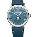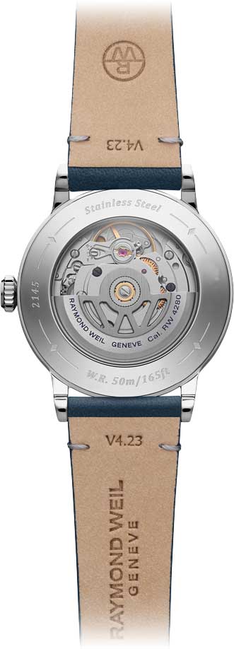 Raymond Weil 2145-SCS-05511—швейцарские часы, сочетающие винтажную эстетику 1930-х годов с современными технологиями. Модель оснащена автоматическим механизмом RW4280 с функцией фазы луны и запасом хода 41 час, заключенным в стальной корпус диаметром 35 мм с сапфировым стекломСапфировое стеклоПрочный и надёжный материал из кристалла сапфира синтетического происхождения, характеризующийся особой твёрдостью и устойчивостью к царапинам и повреждениям., устойчивым к царапинам и бликам. Джинсово-синий секторный циферблат украшен люминесцентнымиЛюминесцентное покрытиеПозволяет считывать показания времени в темноте. Производители наносят на стрелки, часовые индексы, безель или поверхность циферблата светонакопительный состав, дающий холодное свечение. арабскими цифрами, а также 16 синтетическими алмазами 0,26 карат, подчеркивающими изысканность. Синий кожаный ремешок из телячьей кожи дополнен с классической застежкой, обеспечивая комфорт и элегантность. Часы обладают водонепроницаемостью до 50 метров, подходят для повседневного использования.