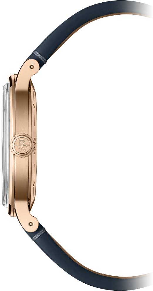 Прозрачная задняя крышка с сапфировым стекломСапфировое стеклоПрочный и надёжный материал из кристалла сапфира синтетического происхождения, характеризующийся особой твёрдостью и устойчивостью к царапинам и повреждениям.. Рифленая заводная головка с логотипом RW.
