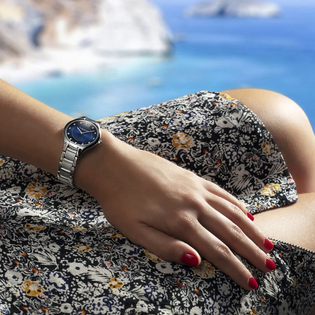 Raymond Weil Noemia 5124-ST-50181 — женские часы, где роскошь встречает швейцарское мастерство. Изысканный аксессуар для тех, кто ценит элегантность и внимание к деталям. Ключевые особенности: Сияющий циферблат Sunray: Градиентный синий оттенок с узором «солнечных лучей» и 11 бриллиантами (0.58 карат) в виде точек. Римская цифра XII на позиции 12 часов добавляет классический шик. Защита и стиль: Сапфировое стеклоСапфировое стеклоПрочный и надёжный материал из кристалла сапфира синтетического происхождения, характеризующийся особой твёрдостью и устойчивостью к царапинам и повреждениям. с антибликовым покрытиемАнтибликовое покрытиеСлой оксида металла в 0,13-0,3 микрон, благодаря которому стекло часов не бликует и не отражает свет. Антибликовое покрытие уменьшает отражение света в 10 раз, обеспечивая отличную читаемость показателей циферблата. сохраняет циферблат идеальным. Швейцарский кварц: Высокая точность (±15 сек/месяц) без необходимости завода. Браслет: с раскладной застёжкойРаскладная застёжкаТакой тип застёжки используется только на браслетах из металла. Она никогда не раскрывается полностью, происходит разделение на 2 и более частей. Раскладывающая застёжка снизит вероятность потери часов к минимуму. для комфорта и безопасности. Детали: Корпус 24 мм: Утончённый дизайн для изящного запястья. Заводная головка: С логотипом RW и лаковым покрытием. Прозрачная задняя крышка: Из сапфираСапфировое стеклоПрочный и надёжный материал из кристалла сапфира синтетического происхождения, характеризующийся особой твёрдостью и устойчивостью к царапинам и повреждениям. — наблюдайте за работой механизма. Noemia 5124-ST-50181 — выбор для тех, кто ищет гармонию бриллиантов, технологий и безупречного стиля.