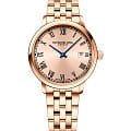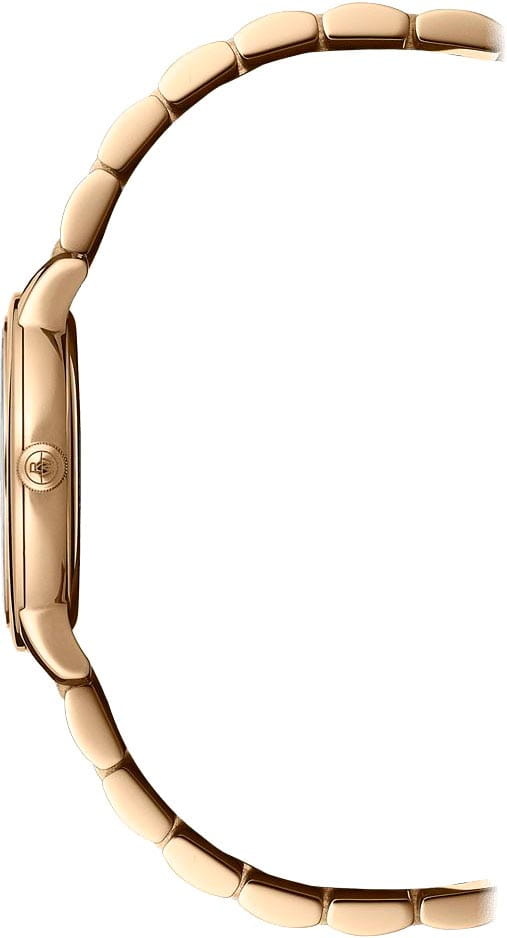 Циферблат розового цвета украшен центральными часовой и минутной стрелками, а также имеет удобную индикацию даты в позиции 3 часа. Часовые метки выполнены в виде римских цифр и точек, что добавляет часам классический и утонченный стиль. Для обеспечения видимости в любых условиях часы оснащены сапфировым стекломСапфировое стеклоПрочный и надёжный материал из кристалла сапфира синтетического происхождения, характеризующийся особой твёрдостью и устойчивостью к царапинам и повреждениям., устойчивым к царапинам и механическим повреждениям.