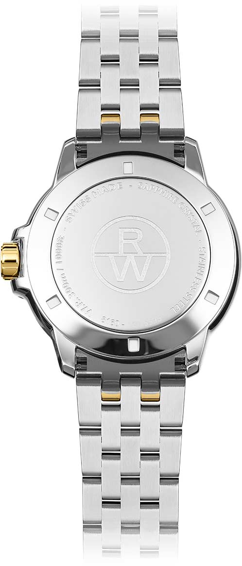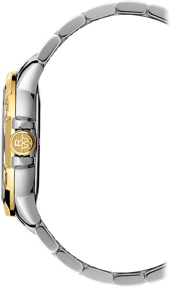 Модель оснащена фирменным безелемБезельВнешний ободок, закрепляющий стекло. В спортивных часах так называется поворотное кольцо с делениями на циферблате, выполняет роль таймера – замеряет отрезки времени на шкале. Неподвижный безель – элемент декора. Однонаправленно вращающийся безель на дайверских часах позволяет фиксировать моменты погружения и выныривания на поверхность. с шестью декоративными винтами и завинчивающейся заводной головкой с защитой и логотипом RW. Завинчивающаяся задняя крышка и стальной браслет на раскладной застёжкеРаскладная застёжкаТакой тип застёжки используется только на браслетах из металла. Она никогда не раскрывается полностью, происходит разделение на 2 и более частей. Раскладывающая застёжка снизит вероятность потери часов к минимуму. с двойной системой защиты добавляет уверенности в использовании.