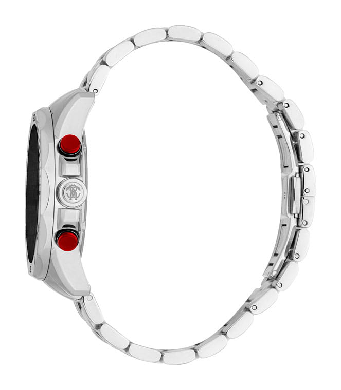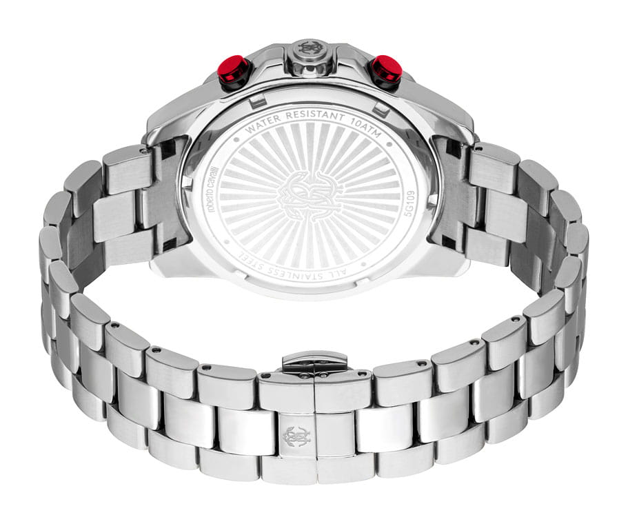 ROBERTO CAVALLI Uomo Sport III RC5G109M0065 — стильные итальянские часы-хронографХронографФункция позволяет измерять отрезки времени с особой точностью: часы, минуты, секунды. Верным признаком хронографа является наличие на циферблате 3 дополнительных окошек-счётчиков. сочетающие в себе элегантность и современный функционал. Корпус диаметром 42 мм выполнен из нержавеющей стали, толщина корпуса составляет 9 мм, что придает модели выразительный внешний вид и надежную защиту от внешних воздействий. Циферблат, искусно оформленный фирменными элементами Roberto Cavalli, притягивает взгляд и подчеркивает ваш безупречный вкус. Часы оснащены кварцевым механизмом, также обладают функцией отображения даты, что делает их удобными для ежедневного использования. Минеральное стеклоМинеральное стеклоМинеральное стекло представляет собой искусственно выращенный минерал кварца. Такое стекло отличается особой устойчивостью к повреждениям и царапинам. Уступает по некоторым качествам сапфировому стеклу. защищает часы от царапин. Водозащита 100 метров позволит плавать, нырять и заниматься другими водными видами спорта. Стальной браслет на застёжке-бабочке с кнопкамиЗастёжка "бабочка"Такой вид застёжки дополняется предохранителями, помогающими избежать случайного раскрытия браслета. Обладают изящным исполнением. обеспечивает комфортное ношение. Стрелки и метки с люминесцентным покрытиемЛюминесцентное покрытиеПозволяет считывать показания времени в темноте. Производители наносят на стрелки, часовые индексы, безель или поверхность циферблата светонакопительный состав, дающий холодное свечение. обеспечивают отличную читаемость в любое время суток.