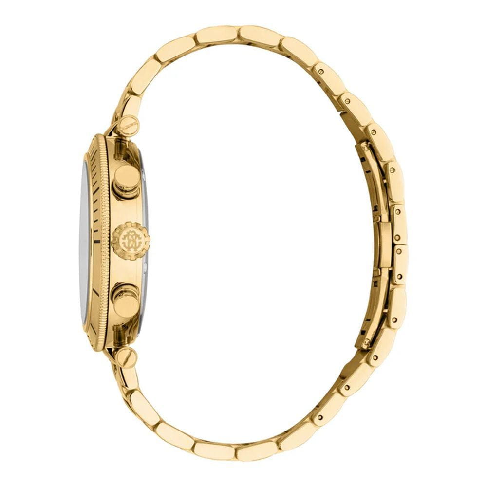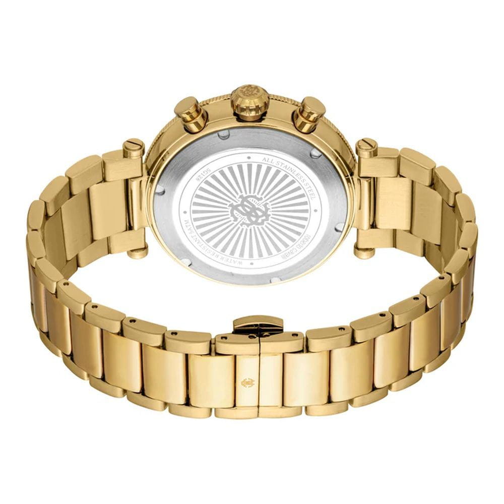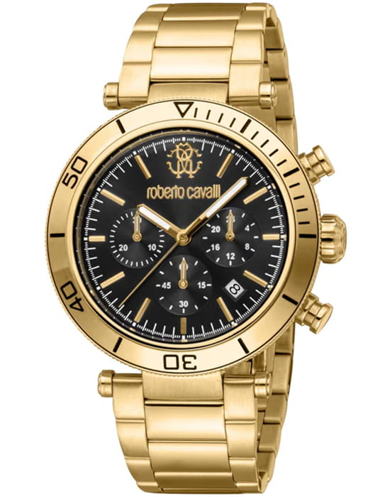 Roberto Cavalli Ritmo RC5G128M0065 — мужская кварцевая модель с ярко выраженным спортивным стилем и практичным функционалом, сочетающая строгий дизайн и надёжность. Корпус с PVD-покрытиемPVDУльтратонкое покрытие наносится в технике вакуумного напыления, сочетает в себе нитрид титана особой прочности со слоем золота или оксида хрома. Несёт в себе декоративную или защитную функцию. диаметром 43 мм и толщиной 12 мм выполнен из нержавеющей стали, защищён прочным минеральным стекломМинеральное стеклоМинеральное стекло представляет собой искусственно выращенный минерал кварца. Такое стекло отличается особой устойчивостью к повреждениям и царапинам. Уступает по некоторым качествам сапфировому стеклу., устойчивым к повседневным повреждениям и сохраняющим хорошую читаемость циферблата. Водозащита 100 м делает часы надёжным спутником во время плавания и активного отдыха. Функциональность поддерживается индикаторами хронографаХронографФункция позволяет измерять отрезки времени с особой точностью: часы, минуты, секунды. Верным признаком хронографа является наличие на циферблате 3 дополнительных окошек-счётчиков. и даты, которые органично вписаны в оформление циферблата. Стальной браслет  с PVD-покрытиемPVDУльтратонкое покрытие наносится в технике вакуумного напыления, сочетает в себе нитрид титана особой прочности со слоем золота или оксида хрома. Несёт в себе декоративную или защитную функцию. на застёжке-бабочке с кнопкамиЗастёжка "бабочка"Такой вид застёжки дополняется предохранителями, помогающими избежать случайного раскрытия браслета. Обладают изящным исполнением. обеспечивает комфортную посадку и долговечность, а также гармонично завершает образ модели, которая одинаково хорошо подойдёт как для динамичного повседневного ритма, так и для более строгих ситуаций.