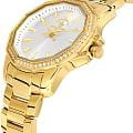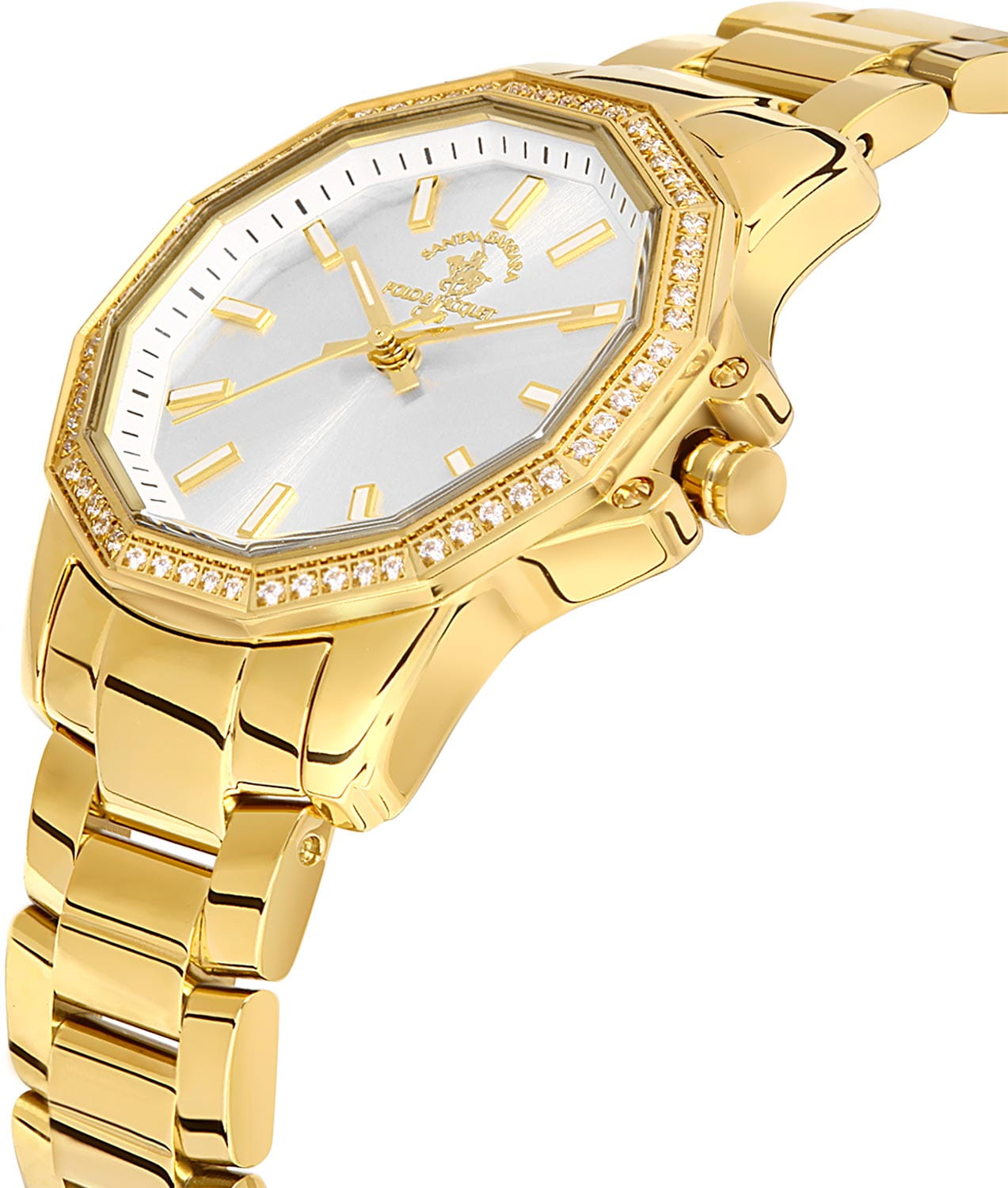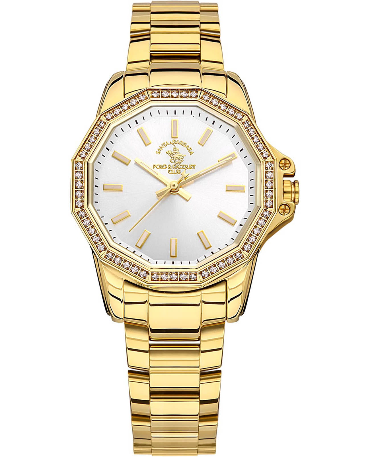 Женские кварцевые часы Santa Barbara Polo & Racquet Club — это изысканный и привлекательный аксессуар. Корпус диаметром 34 мм выполнен из латуни с IP-покрытиемIP-покрытиеМетод ионного напыления. Демонстрирует повышенную устойчивость к истиранию, окислению и химическим веществам. Под воздействием высокого давления и температуры около 1500°C молекулы металла надёжно соединяются с частицами корпуса часов.. БезельБезельВнешний ободок, закрепляющий стекло. В спортивных часах так называется поворотное кольцо с делениями на циферблате, выполняет роль таймера – замеряет отрезки времени на шкале. Неподвижный безель – элемент декора. Однонаправленно вращающийся безель на дайверских часах позволяет фиксировать моменты погружения и выныривания на поверхность. 12-гранной формы украшен кристаллами. Циферблат серебристого цвета выполнен по технологии Sunray («солнечные лучи») и оформлен штрихами и стрелками. Стрелки с люминесцентным покрытиемЛюминесцентное покрытиеПозволяет считывать показания времени в темноте. Производители наносят на стрелки, часовые индексы, безель или поверхность циферблата светонакопительный состав, дающий холодное свечение., обеспечивающим хорошую читаемость в темноте. Циферблат защищён минеральным стекломМинеральное стеклоМинеральное стекло представляет собой искусственно выращенный минерал кварца. Такое стекло отличается особой устойчивостью к повреждениям и царапинам. Уступает по некоторым качествам сапфировому стеклу.. Механизм — кварцевый калибр Miyota 2035. Заводная головка с защитой повышает надёжность. Часы оснащены стальным браслетом с IP-покрытиемIP-покрытиеМетод ионного напыления. Демонстрирует повышенную устойчивость к истиранию, окислению и химическим веществам. Под воздействием высокого давления и температуры около 1500°C молекулы металла надёжно соединяются с частицами корпуса часов. на раскладной застёжкеРаскладная застёжкаТакой тип застёжки используется только на браслетах из металла. Она никогда не раскрывается полностью, происходит разделение на 2 и более частей. Раскладывающая застёжка снизит вероятность потери часов к минимуму.. Водонепроницаемость 50 м позволяет использовать часы в повседневных условиях. Идеальный выбор для тех, кто ценит американское качество и женственный дизайн.