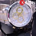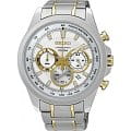 Современные японские наручные кварцевые мужские часы. Круглый корпус часов выполнен из  высокопрочной стали с антикоррозийными свойствами с частичным PVD покрытием. Серебристый фон циферблата и золотые элементы дизайна. Водонепроницаемость 10 ATM. Минеральное стекло Hardlex, устойчивое к появлению царапин.  Часы оснащены хронографом.