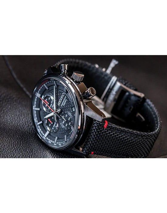 Аксессуар выполнен из нержавеющей стали 316L, материал устойчив к повреждениям. Кварцевый хронографХронографФункция позволяет измерять отрезки времени с особой точностью: часы, минуты, секунды. Верным признаком хронографа является наличие на циферблате 3 дополнительных окошек-счётчиков. оснащён японским механизмом Seiko 8T67 с точностью хода ±15 секунд в месяц. Калибр работает от батарейки, рассчитанной на 3 года. Функции: секундомер, календарь, тахиметрТахиметрРазмеченная шкала, располагается на ободке или безеле часов. Тахиметр позволяет рассчитать скорость на определённом участке пути, расстояние измеряется в километрах или милях.. Ремешок из нейлона имеет кожаную основу.