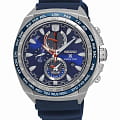 Сине-серебристая модель дополнена силиконовым ремешком, обеспечивающим комфортное ношение. Работу часов обеспечивает японский кварцевый механизм V195, реализуется питание по технологии . Опции: секундомер, мировое времяМировое время Полезное часовое усложнение, отображающее время в основных городах и известных областях по всему миру, оно связано с часовыми поясами, удобно для путешественников и бизнесменов. , календарь, хронографХронографФункция позволяет измерять отрезки времени с особой точностью: часы, минуты, секунды. Верным признаком хронографа является наличие на циферблате 3 дополнительных окошек-счётчиков.. На стрелки и метки нанесено люминесцентное покрытиеЛюминесцентное покрытиеПозволяет считывать показания времени в темноте. Производители наносят на стрелки, часовые индексы, безель или поверхность циферблата светонакопительный состав, дающий холодное свечение.. Минеральное стекло Hardlex устойчиво к царапинам.