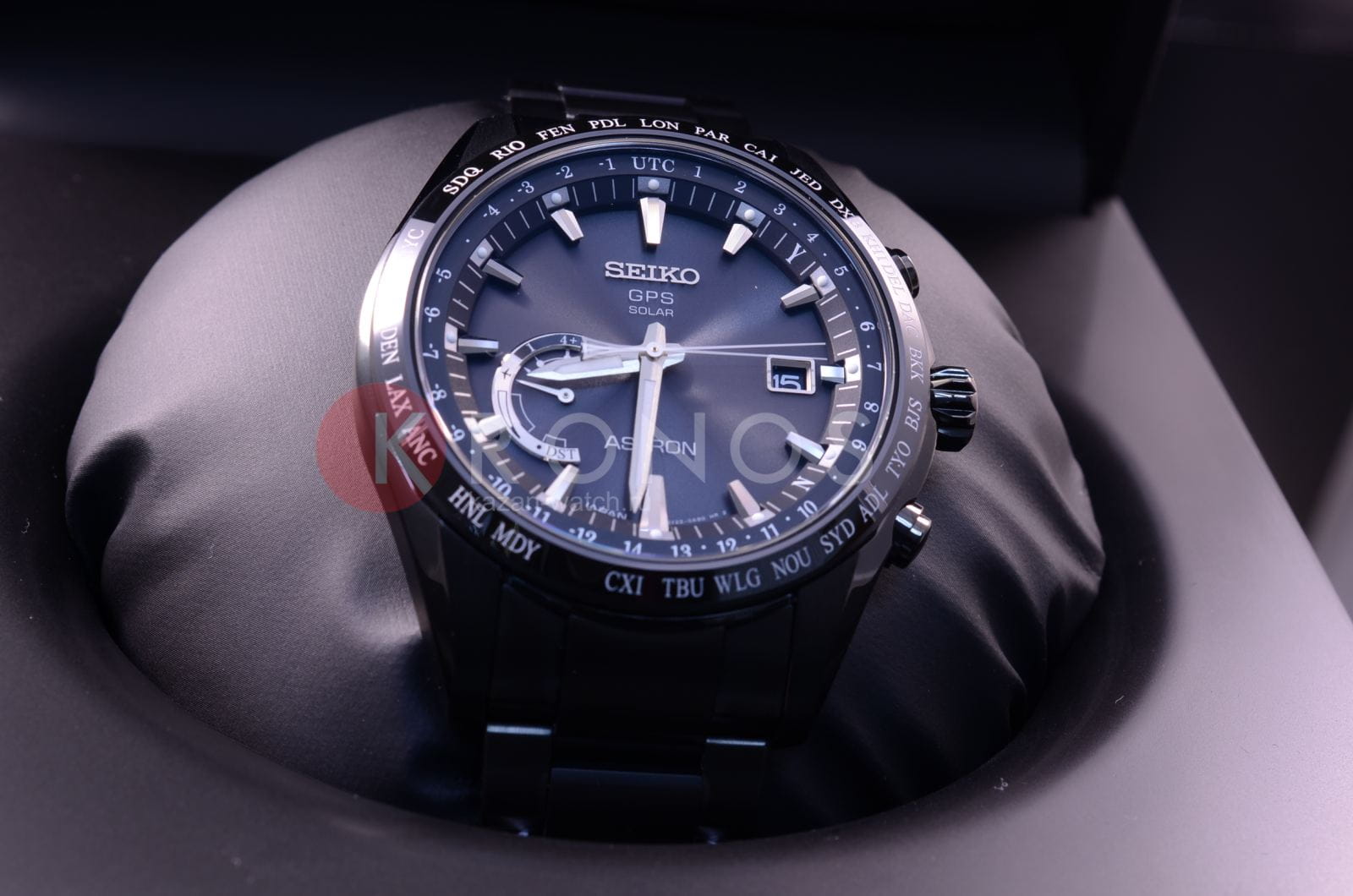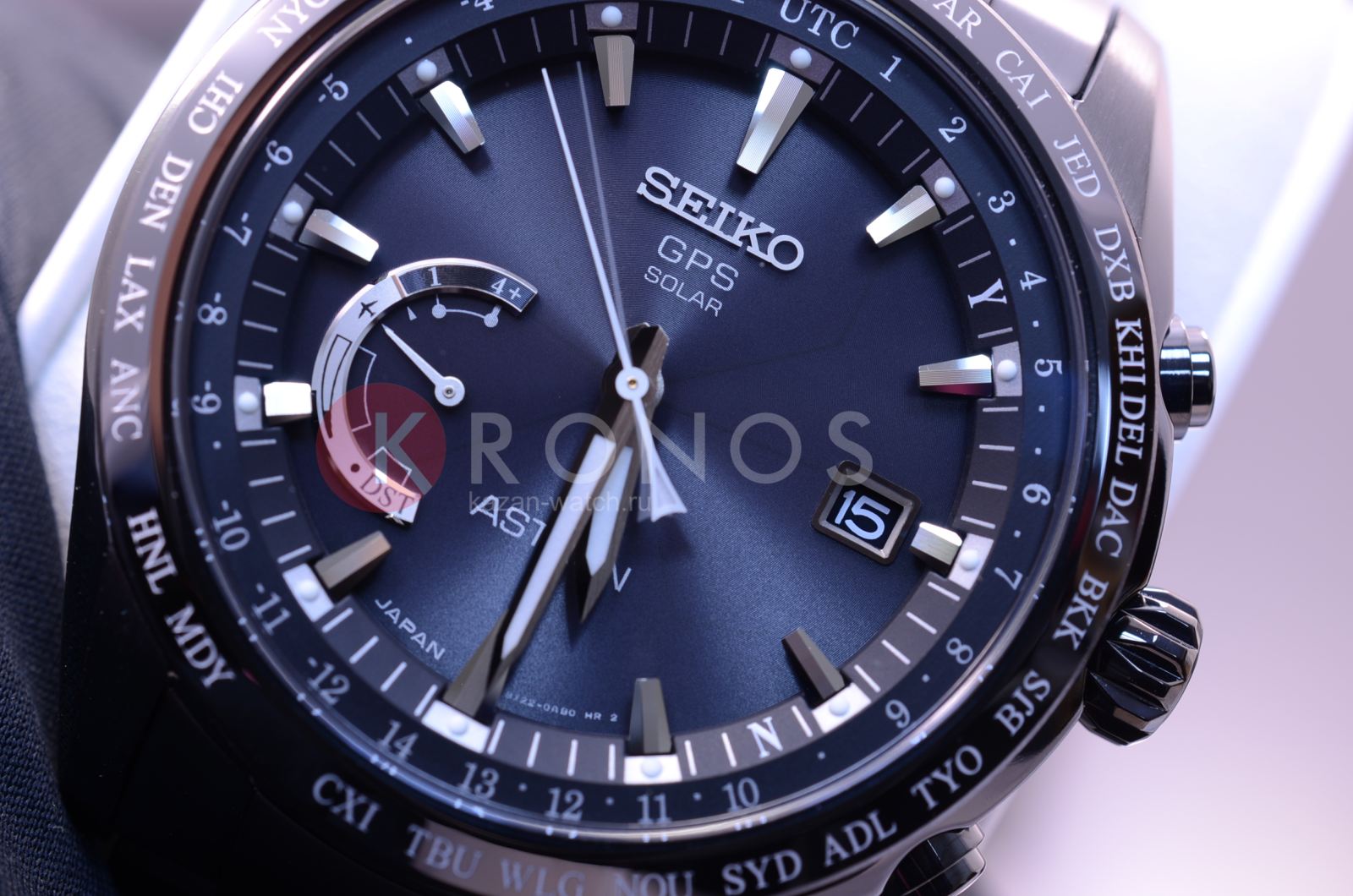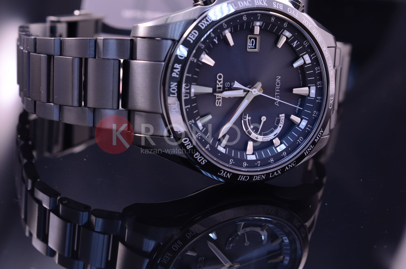 Astron GPS Solar World-Time. Часы со встроенным GPS-приемником определяют часовой пояс, дату и точное время. Питание от солнечной энергии, индикатор уровня зарядки батареи. Функция сохранения энергии. Запас хода при полной зарядке аккумулятора 6 месяцев, при включенной функции сохранения энергии - 2 года. Ручная и автоматическая корректировка времени и часового пояса. Установка летнего времени. Функции приема GPS-сигнала: режим ''В полете'', показ количества спутников, показ результата последнего приема, проверка установленного часового пояса, автоматический прием информации о секунде координации. Мировое время - часы распознают 40 часовых поясов. Ретроградный индикатор отображает: состояние зарядки батареи, режим ''В полете'', включение/отключение летнего времени. Керамический безель. Завинчивающаяся задняя крышка. Браслет с раскладывающейся застежкой.