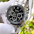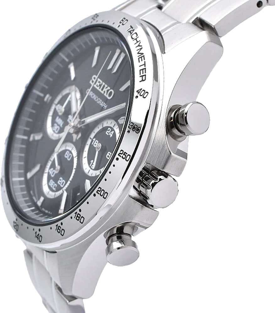 Мужские кварцевые часы Seiko SBTR013 из коллекции Spirit — это сочетание точности, функциональности и современного дизайна. Часы оснащены японским механизмом калибра 8T63 с функцией хронографаХронографФункция позволяет измерять отрезки времени с особой точностью: часы, минуты, секунды. Верным признаком хронографа является наличие на циферблате 3 дополнительных окошек-счётчиков., включающей секундомер с точностью 1/5 секунды и временем измерения до 1 часа, отображаемый центральной стрелкой. Также реализована функция тахиметраТахиметрРазмеченная шкала, располагается на ободке или безеле часов. Тахиметр позволяет рассчитать скорость на определённом участке пути, расстояние измеряется в километрах или милях.. Центральные часовая и минутная стрелки дополнены вынесенной секундной стрелкой на отдельном циферблате, окошко даты расположено между отметками 4 и 5 часов. Циферблат чёрного цвета оформлен штриховыми метками, стрелки и метки покрыты люминесцентным покрытиемЛюминесцентное покрытиеПозволяет считывать показания времени в темноте. Производители наносят на стрелки, часовые индексы, безель или поверхность циферблата светонакопительный состав, дающий холодное свечение. LumiBrite, обеспечивающим хорошую читаемость в темноте. Корпус выполнен из нержавеющей стали и защищён прочным минеральным стеклом Hardlex, устойчивым к царапинам. Браслет из нержавеющей стали фиксируется на раскладной застёжкеРаскладная застёжкаТакой тип застёжки используется только на браслетах из металла. Она никогда не раскрывается полностью, происходит разделение на 2 и более частей. Раскладывающая застёжка снизит вероятность потери часов к минимуму.. Водонепроницаемость 100 м позволяет использовать часы для плавания, ныряния и других водных видов спорта. Модель подходит как для повседневного, так и для делового образа.