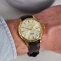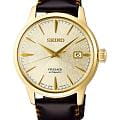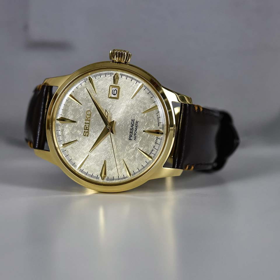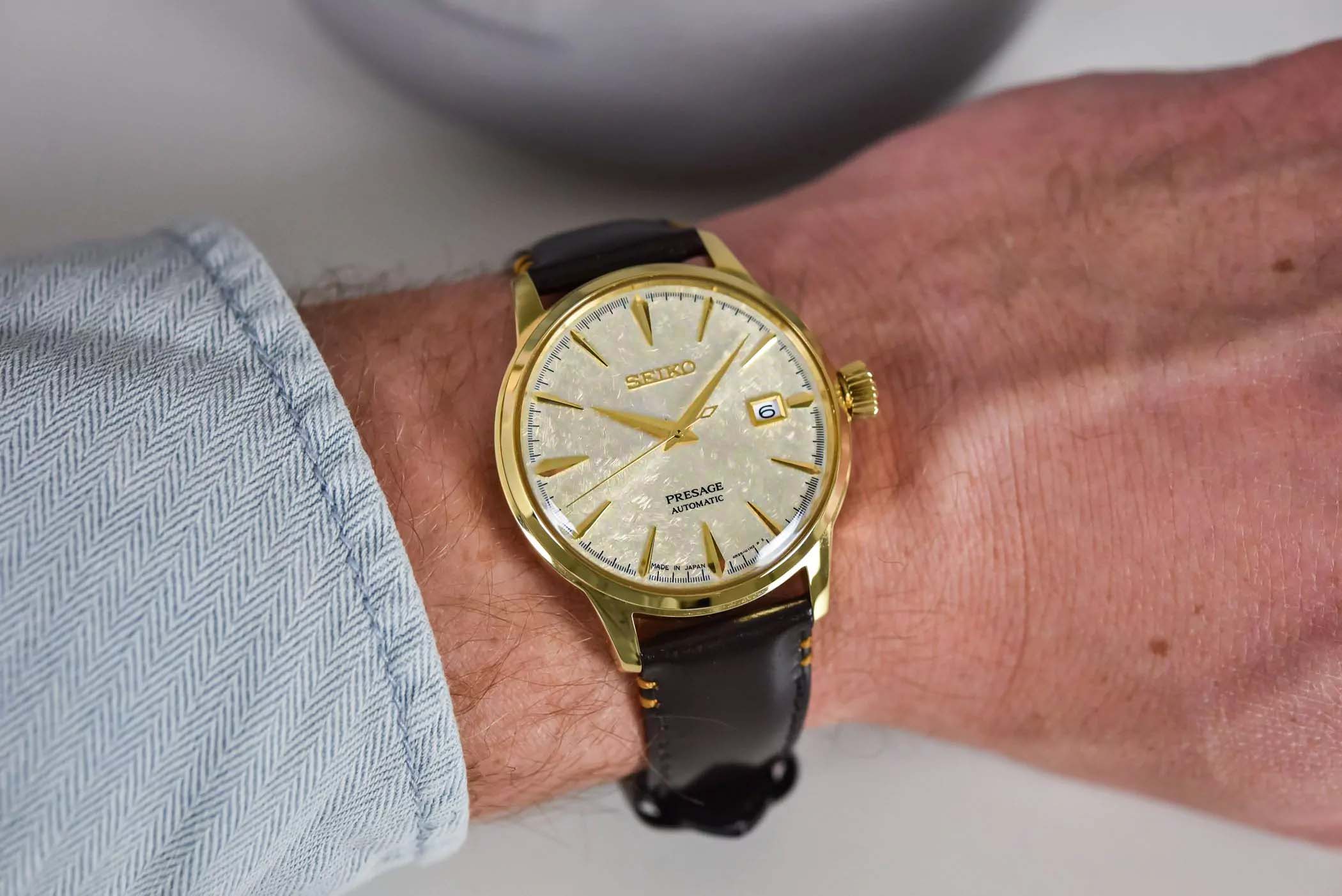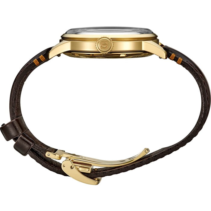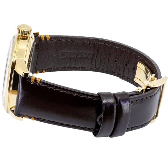 Мужские механические часы Seiko из лимитированной коллекции Presage — это сочетание японского мастерства и вдохновения барменского искусства. Модель вдохновлена коктейлем Houjou, созданным знаменитым японским барменом Хисаси Киси. Корпус выполнен из нержавеющей стали и защищён минеральным стекломМинеральное стеклоМинеральное стекло представляет собой искусственно выращенный минерал кварца. Такое стекло отличается особой устойчивостью к повреждениям и царапинам. Уступает по некоторым качествам сапфировому стеклу. Hardlex. Циферблат круглой формы выполнен в насыщенном жёлтом цвете, отражающем характер коктейля, и дополнен индексами. Окошко даты расположено на отметке 3 часа. Механизм — автоматический калибр Seiko 4R35 с ручным подзаводом, содержит 23 драгоценных камня, обеспечивает запас хода до 41 часа при тактовой частоте 21 600 полуколебаний в час. Точность хода составляет -35/+45 секунд в сутки. Часы оснащены функцией стоп-секунды для точной установки времени. Задняя крышка — завинчивающаяся и прозрачная, что подчёркивает открытый взгляд на механизм. Ремешок из кожи коричневого цвета фиксируется на классической пряжке. Водонепроницаемость составляет , что позволяет использовать часы для плавания, ныряния и других водных видов спорта. Модель отличается уникальным дизайном и является частью лимитированного выпуска.