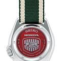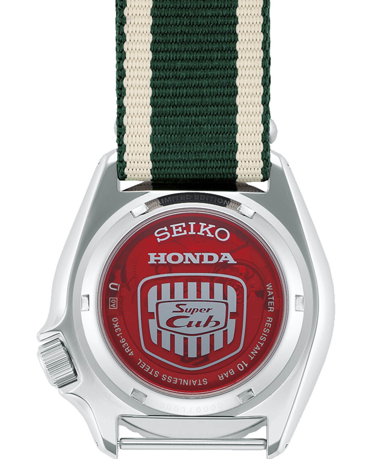 Мужские механические часы с автоподзаводом Seiko SRPJ49K1 — коллаборация с Honda в честь мотоцикла Super Cub 110. Корпус из нержавеющей стали, диаметром 42,5 мм. Циферблат — зелёно-белый, с окошками дня недели и даты в положении 3 часов. Стекло — минеральноеМинеральное стеклоМинеральное стекло представляет собой искусственно выращенный минерал кварца. Такое стекло отличается особой устойчивостью к повреждениям и царапинам. Уступает по некоторым качествам сапфировому стеклу. Hardlex. БезельБезельВнешний ободок, закрепляющий стекло. В спортивных часах так называется поворотное кольцо с делениями на циферблате, выполняет роль таймера – замеряет отрезки времени на шкале. Неподвижный безель – элемент декора. Однонаправленно вращающийся безель на дайверских часах позволяет фиксировать моменты погружения и выныривания на поверхность. однонаправленно вращающийся с PVD-покрытиемPVDУльтратонкое покрытие наносится в технике вакуумного напыления, сочетает в себе нитрид титана особой прочности со слоем золота или оксида хрома. Несёт в себе декоративную или защитную функцию.. Стрелки и метки с люминесцентным покрытиемЛюминесцентное покрытиеПозволяет считывать показания времени в темноте. Производители наносят на стрелки, часовые индексы, безель или поверхность циферблата светонакопительный состав, дающий холодное свечение. LumiBrite. Ремешок — двухцветный нейлоновый на стандартной застёжке. Водонепроницаемость 100 м. Механизм — японский калибр 4R36 с ручным заводом и запасом хода около 41 часа. Идеальный выбор для тех, кто ценит японское качество и нестандартный дизайн.
