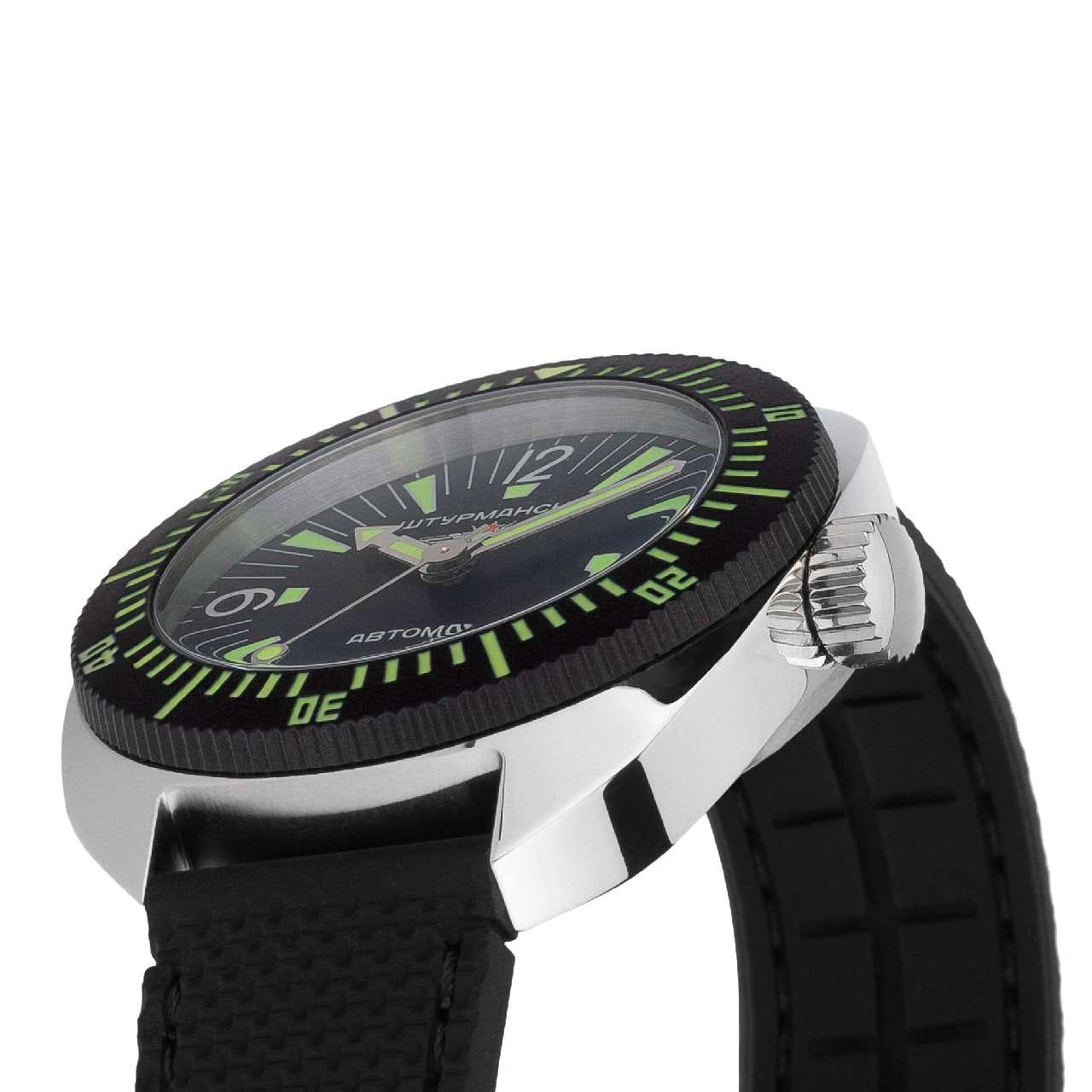Мужские механические часы с автоподзаводом Штурманские Амфибия 2416/8881505 с высокой точностью. Корпус из нержавеющей стали диаметром 42 мм идеально сбалансирован и элегантен. Минеральное стеклоМинеральное стеклоМинеральное стекло представляет собой искусственно выращенный минерал кварца. Такое стекло отличается особой устойчивостью к повреждениям и царапинам. Уступает по некоторым качествам сапфировому стеклу. устойчивое к мелким механическим повреждениям. Силиконовый ремешок на стандартной застёжке, обеспечивает комфортное ношение. Класс водозащиты: 200 метров, позволит плавать, нырять и заниматься другими водными видами спорта. Стрелки и метки на циферблате имеют люминесцентное покрытиеЛюминесцентное покрытиеПозволяет считывать показания времени в темноте. Производители наносят на стрелки, часовые индексы, безель или поверхность циферблата светонакопительный состав, дающий холодное свечение. позволяющее легко определять время даже в темноте. Окошко даты находится в положении 3 часа. Рифленая заводная головка. БезельБезельВнешний ободок, закрепляющий стекло. В спортивных часах так называется поворотное кольцо с делениями на циферблате, выполняет роль таймера – замеряет отрезки времени на шкале. Неподвижный безель – элемент декора. Однонаправленно вращающийся безель на дайверских часах позволяет фиксировать моменты погружения и выныривания на поверхность. с PVD-покрытиемPVDУльтратонкое покрытие наносится в технике вакуумного напыления, сочетает в себе нитрид титана особой прочности со слоем золота или оксида хрома. Несёт в себе декоративную или защитную функцию. и минутной шкалой поворачивается в одном направлении.