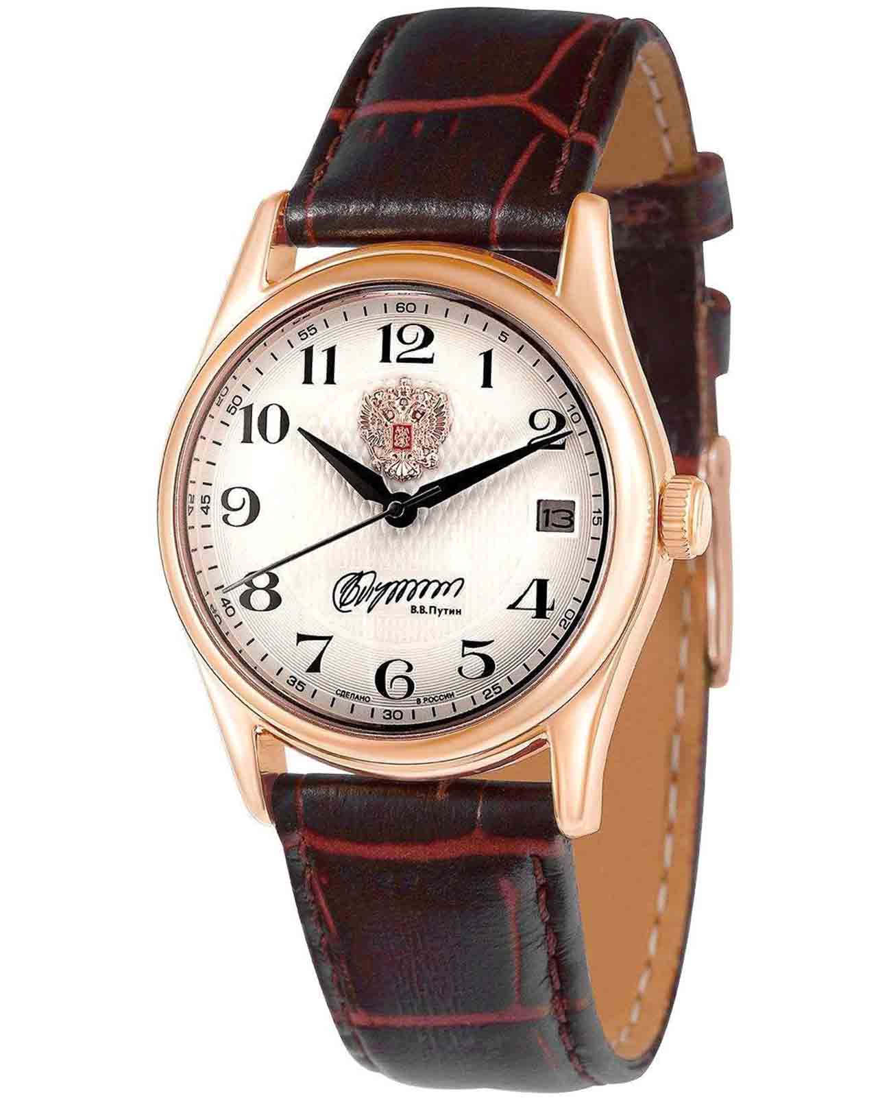 Российские механические наручные часы Слава 1503951/300-NH15, которые станут идеальным аксессуаром для повседневного ношения. Эти часы сочетают в себе элегантность и практичность, предлагая безупречный стиль и надежность. Оснащенные механизмом Seiko TMI NH15 с автоподзаводом, они обеспечивают точность и долговечность. Стальной корпус с IP-покрытиемIP-покрытиеМетод ионного напыления. Демонстрирует повышенную устойчивость к истиранию, окислению и химическим веществам. Под воздействием высокого давления и температуры около 1500°C молекулы металла надёжно соединяются с частицами корпуса часов. и сапфировым стекломСапфировое стеклоПрочный и надёжный материал из кристалла сапфира синтетического происхождения, характеризующийся особой твёрдостью и устойчивостью к царапинам и повреждениям. защищает белый циферблат с арабскими цифрами. На циферблате изображены герб Российской Федерации и автограф В.В. Путина. Часы также имеют календарь с окошком даты на 3 часах и водозащиту до 50WR, что делает их надежными в различных условиях. Текстурированный кожаный ремешок с классической застежкой завершает этот изысканный образ.