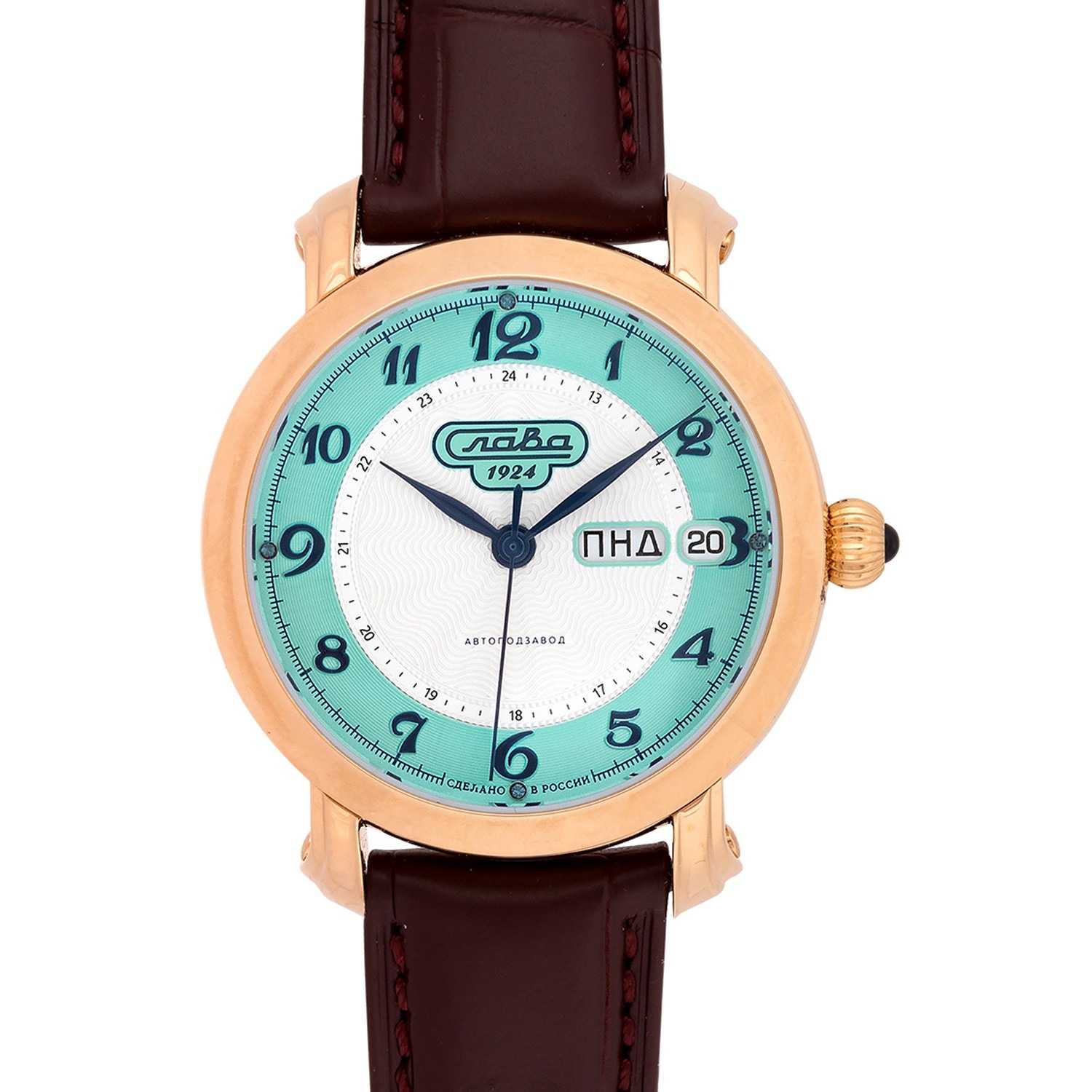 Наручные часы Слава Слава России 2443617/300-2427 — воплощение классического стиля и исключительного качества, произведенные в России. Эта модель из лимитированной коллекции, выпущенной в количестве всего 300 экземпляров, станет великолепным дополнением к вашему образу. Часы оснащены надежным механическим механизмом "Слава 2427" с автоподзаводом, обеспечивающим точный ход и оснащены двойным календарем, что позволяет всегда быть в курсе текущей даты. Корпус из нержавеющей стали с золотистым PVDPVDУльтратонкое покрытие наносится в технике вакуумного напыления, сочетает в себе нитрид титана особой прочности со слоем золота или оксида хрома. Несёт в себе декоративную или защитную функцию. покрытием диаметром 41 мм и толщиной 14,2 мм отличается высокой прочностью и водозащитой до 5 ATM. Серебристо-бирюзовый циферблат с арабскими цифрами защищен сапфировым стекломСапфировое стеклоПрочный и надёжный материал из кристалла сапфира синтетического происхождения, характеризующийся особой твёрдостью и устойчивостью к царапинам и повреждениям., устойчивым к царапинам, что позволяет надолго сохранить безупречный вид часов. На 3 часах расположено окошко с указателем даты и дня недели. Кожаный ремень из крокодила с застежкой «бабочка»Застёжка "бабочка"Такой вид застёжки дополняется предохранителями, помогающими избежать случайного раскрытия браслета. Обладают изящным исполнением. добавляет элегантности и комфорта, создавая ощущение роскоши и изысканности. Эта модель станет идеальным выбором для тех, кто ценит традиции и высокое качество в сочетании с современным дизайном.