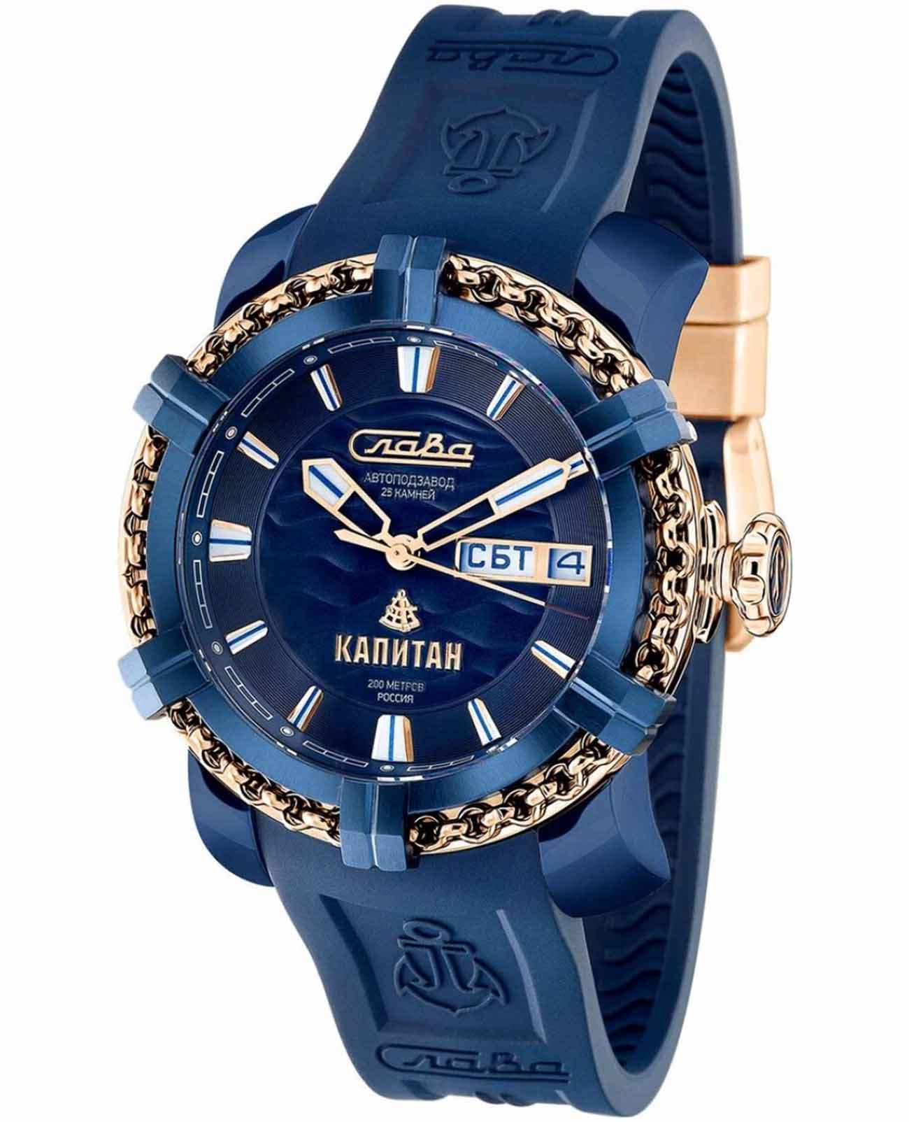 Российские механические наручные часы Слава Капитан 2473355/800-2427 — идеальный выбор для мужчин, ценящих стиль и надежность. Эта уникальная модель выпущена ограниченной серией в 500 экземпляров и сочетает в себе модный дизайн и высокое качество исполнения. Корпус часов выполнен из прочной стали с синим IP-покрытиемIP-покрытиеМетод ионного напыления. Демонстрирует повышенную устойчивость к истиранию, окислению и химическим веществам. Под воздействием высокого давления и температуры около 1500°C молекулы металла надёжно соединяются с частицами корпуса часов. и имеет диаметр 44 мм и толщину 16 мм, что придает им солидный и мужественный вид. БезельБезельВнешний ободок, закрепляющий стекло. В спортивных часах так называется поворотное кольцо с делениями на циферблате, выполняет роль таймера – замеряет отрезки времени на шкале. Неподвижный безель – элемент декора. Однонаправленно вращающийся безель на дайверских часах позволяет фиксировать моменты погружения и выныривания на поверхность. часов с IP-покрытиемIP-покрытиеМетод ионного напыления. Демонстрирует повышенную устойчивость к истиранию, окислению и химическим веществам. Под воздействием высокого давления и температуры около 1500°C молекулы металла надёжно соединяются с частицами корпуса часов. покрытием сине-золотого цвета, выполненный в форме штурвала под стать названию коллекции "Капитан", придаёт часам неповторимый морской характер и стиль. Водозащита до 20 ATM позволяет использовать часы даже при погружении в воду, что делает их отличным выбором для активных мужчин. Синий циферблат с метками и сапфировое стеклоСапфировое стеклоПрочный и надёжный материал из кристалла сапфира синтетического происхождения, характеризующийся особой твёрдостью и устойчивостью к царапинам и повреждениям. обеспечивают долговечность и устойчивость к царапинам. Механический механизм "Слава 2427" с автоподзаводом и возможностью ручного подзавода гарантирует точность и надежность, а двойной календарь добавляет функциональности. На 3 часах расположено окошко с указателем даты и дня недели. Часы комплектуются прочным силиконовым ремешком со стандартной застежкой, обеспечивающим комфорт и надежную фиксацию на запястье. Задняя крышка крепится на 4-х винтах и украшена объемным изображением якоря. Индивидуальный серийный номер. Упакованы в стильную подарочную коробку из экокожи, они станут отличным подарком для любого особого случая. С часами Слава из коллекции Капитан вы подчеркнете свой статус и вкус, оставаясь верным российским традициям качества и стиля.