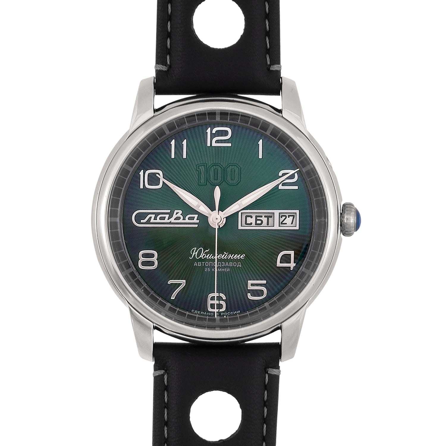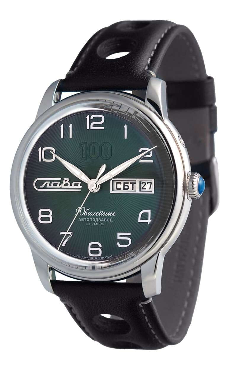 Часы Слава Юбилейные 2600674/300-2427 представляют собой воплощение российского часового искусства, сочетая в себе традиции и современные технологии. Эти механические часы с автоподзаводом оснащены калибром «Слава 2427», который обеспечивает надежную и точную работу. Корпус из высококачественной стали диаметром 44 мм и толщиной 14,5 мм придает часам солидность и долговечность. Циферблат выполнен в благородном зеленом цвете и оформлен арабскими цифрами, обеспечивая удобство чтения времени. Прочное выпуклое сапфировое стеклоСапфировое стеклоПрочный и надёжный материал из кристалла сапфира синтетического происхождения, характеризующийся особой твёрдостью и устойчивостью к царапинам и повреждениям. защищает циферблат от царапин и повреждений. Особенностью модели является наличие календаря, отображающего число и день недели в положении 3 часа. Стрелки с люминесцентным покрытиемЛюминесцентное покрытиеПозволяет считывать показания времени в темноте. Производители наносят на стрелки, часовые индексы, безель или поверхность циферблата светонакопительный состав, дающий холодное свечение., что облегчает чтение времени даже в условиях слабого освещения. Часы обладают водозащитой уровня 100WR, что делает их подходящими для повседневного ношения и активного образа жизни. Кожаный ремешок с классической застежкой добавляет модели изысканности и комфорта в носке. Эта модель представлена в лимитированной серии из 300 экземпляров, что делает её не только надежным функциональным аксессуаром, но и ценным предметом для коллекционеров. Прозрачная задняя крышка позволяет наблюдать за работой механизма, который включает в себя 25 камней и имеет частоту 18000 полуколебаний в час. Запас хода составляет до 40 часов, а противоударное устройство оси баланса обеспечивает дополнительную надежность.