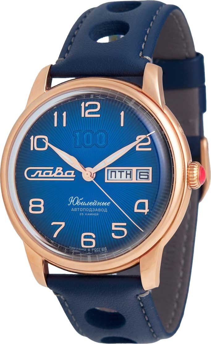 Часы Слава Юбилейные 2603673/300-2427 представляют собой воплощение российского часового искусства, сочетая в себе традиции и современные технологии. Эти механические часы с автоподзаводом оснащены калибром «Слава 2427», который обеспечивает надежную и точную работу. Корпус из высококачественной стали с IP-покрытиемIP-покрытиеМетод ионного напыления. Демонстрирует повышенную устойчивость к истиранию, окислению и химическим веществам. Под воздействием высокого давления и температуры около 1500°C молекулы металла надёжно соединяются с частицами корпуса часов. диаметром 44 мм и толщиной 14,5 мм придает часам солидность и долговечность. Циферблат выполнен в благородном синем цвете и оформлен арабскими цифрами, обеспечивая удобство чтения времени. Прочное выпуклое сапфировое стеклоСапфировое стеклоПрочный и надёжный материал из кристалла сапфира синтетического происхождения, характеризующийся особой твёрдостью и устойчивостью к царапинам и повреждениям. защищает циферблат от царапин и повреждений. Особенностью модели является наличие календаря, отображающего число и день недели в положении 3 часа. Стрелки с люминесцентным покрытиемЛюминесцентное покрытиеПозволяет считывать показания времени в темноте. Производители наносят на стрелки, часовые индексы, безель или поверхность циферблата светонакопительный состав, дающий холодное свечение., что облегчает чтение времени даже в условиях слабого освещения. Часы обладают водозащитой уровня 100WR, что делает их подходящими для повседневного ношения и активного образа жизни. Кожаный ремешок с классической застежкой добавляет модели изысканности и комфорта в носке. Эта модель представлена в лимитированной серии из 300 экземпляров, что делает её не только надежным функциональным аксессуаром, но и ценным предметом для коллекционеров. Прозрачная задняя крышка позволяет наблюдать за работой механизма, который включает в себя 25 камней и имеет частоту 18000 полуколебаний в час. Запас хода составляет до 40 часов, а противоударное устройство оси баланса обеспечивает дополнительную надежность.