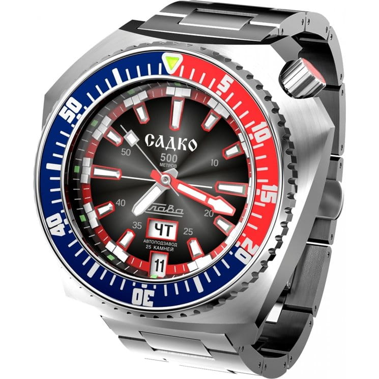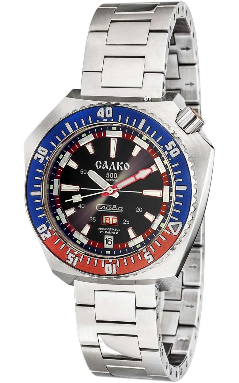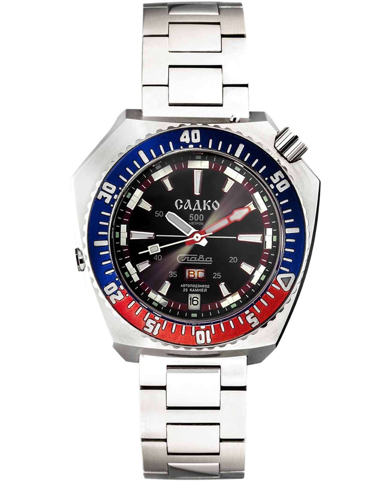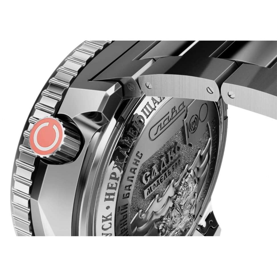 Стильные часы Слава Садко 5007171/100-2427 — станут надежным спутником как в повседневной жизни, так и при покорении морских глубин. Эти часы, созданные в России, оснащены механическим механизмом Слава 2427 с автоподзаводом, который обеспечивает точность и надежность. Корпус выполнен из высококачественной стали 316L. Поворотный безельБезельВнешний ободок, закрепляющий стекло. В спортивных часах так называется поворотное кольцо с делениями на циферблате, выполняет роль таймера – замеряет отрезки времени на шкале. Неподвижный безель – элемент декора. Однонаправленно вращающийся безель на дайверских часах позволяет фиксировать моменты погружения и выныривания на поверхность. часов с IP-покрытиемIP-покрытиеМетод ионного напыления. Демонстрирует повышенную устойчивость к истиранию, окислению и химическим веществам. Под воздействием высокого давления и температуры около 1500°C молекулы металла надёжно соединяются с частицами корпуса часов. красного и синего цвета придаёт модели особую элегантность и долговечность. Черный циферблат с метками в виде штрихов надежно защищён сапфировым стекломСапфировое стеклоПрочный и надёжный материал из кристалла сапфира синтетического происхождения, характеризующийся особой твёрдостью и устойчивостью к царапинам и повреждениям., толщина которого составляет 3 мм. Заводная головка с защитой, расположенная в положении 2 часа, и литой стальной браслет с застежкой «бабочка»Застёжка "бабочка"Такой вид застёжки дополняется предохранителями, помогающими избежать случайного раскрытия браслета. Обладают изящным исполнением. обеспечивают комфорт и удобство в использовании. Эти часы имеют водозащиту 500WR, позволяя погружаться на глубину до 50 атмосфер, что делает их идеальными для дайвинга. Автоматический гелиевый клапан добавляет дополнительную надежность при подводных приключениях. Функциональность часов дополнена календарём с отображением числа и дня недели, который удобно расположен в позиции 6 часов. Кнопка быстрого перевода календаря делает настройку простой и лёгкой. Стрелки и метки обладают люминесцентным покрытиемЛюминесцентное покрытиеПозволяет считывать показания времени в темноте. Производители наносят на стрелки, часовые индексы, безель или поверхность циферблата светонакопительный состав, дающий холодное свечение., которое светится в темноте после зарядки на свету, обеспечивая отличную видимость в любых условиях. Каждый экземпляр из лимитированной серии в 500 штук уникален и имеет номер на задней крышке, украшенной объёмным изображением, выполненным методом чеканки. Механизм часов поддерживает 25 камней и работает с частотой 18000 полуколебаний в час, предлагая запас хода до 40 часов и возможность ручного завода. Противоударное устройство оси баланса добавляет уверенности в их долговечности. Эти часы — идеальный выбор для тех, кто ценит стиль, надежность и функциональность в одном аксессуаре.