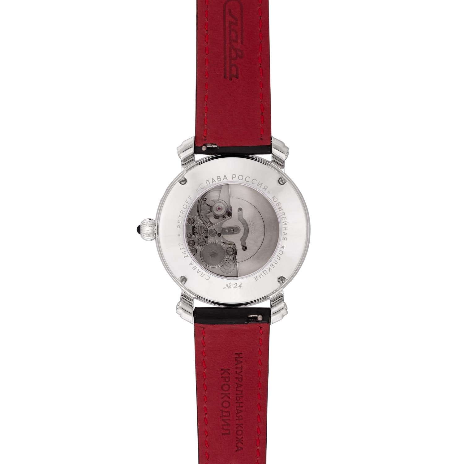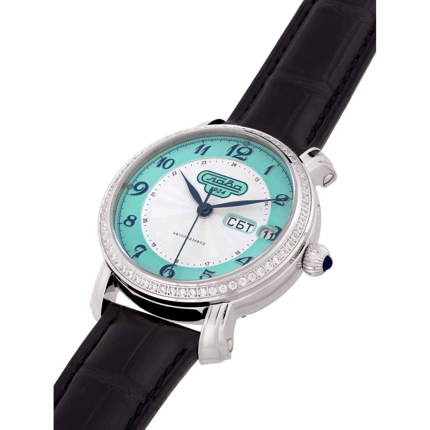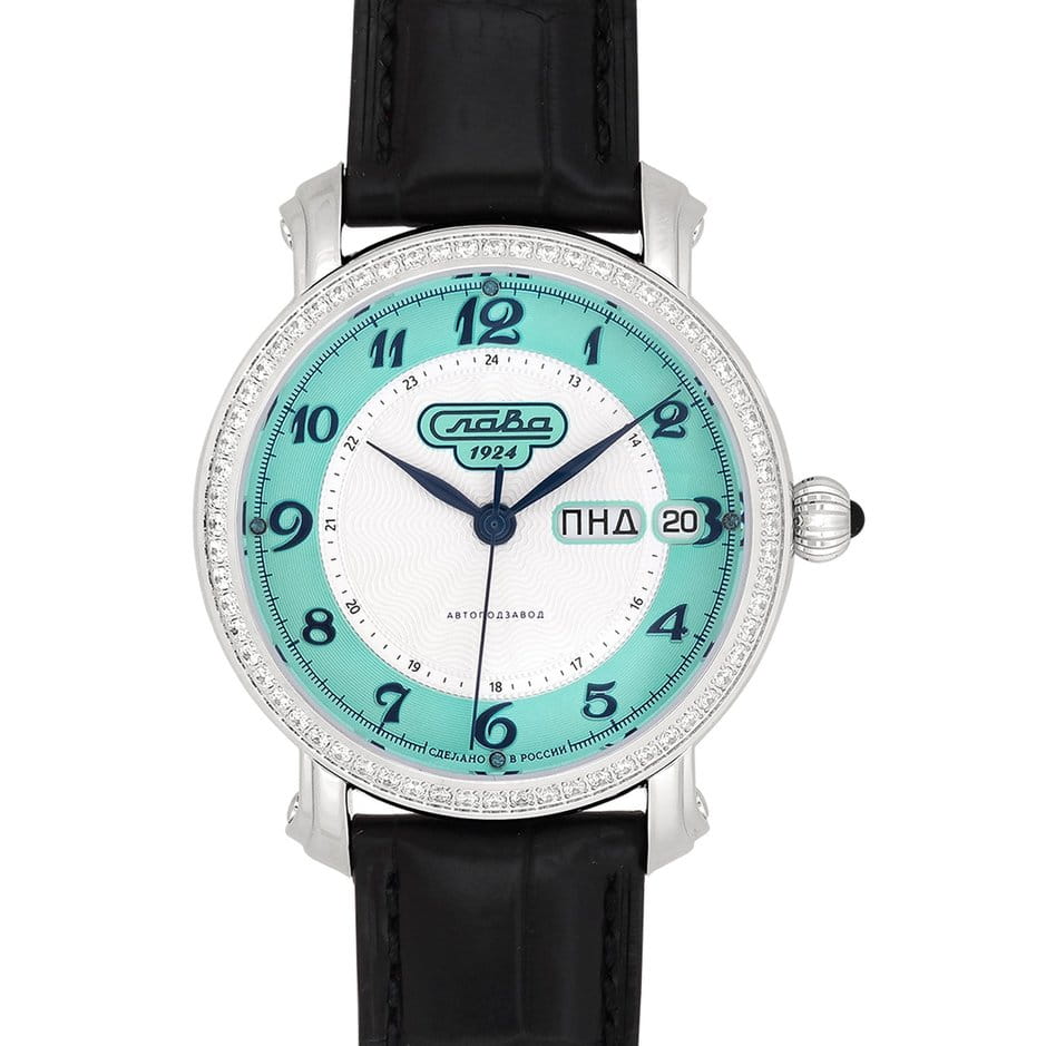 Наручные часы Слава Слава России 7440617/300-2427-68 — воплощение классического стиля и исключительного качества, произведенные в России. Эта модель из лимитированной коллекции станет великолепным дополнением к вашему образу. Часы оснащены надежным механическим механизмом "Слава 2427" с автоподзаводом, обеспечивающим точный ход и оснащены двойным календарем, что позволяет всегда быть в курсе текущей даты. Корпус из нержавеющей стали с родиевым покрытием диаметром 41 мм и толщиной 14,2 мм отличается высокой прочностью и водозащитой до 5 ATM. БезельБезельВнешний ободок, закрепляющий стекло. В спортивных часах так называется поворотное кольцо с делениями на циферблате, выполняет роль таймера – замеряет отрезки времени на шкале. Неподвижный безель – элемент декора. Однонаправленно вращающийся безель на дайверских часах позволяет фиксировать моменты погружения и выныривания на поверхность. часов с вставками из камней циркона. Серебристо-бирюзовый циферблат с арабскими цифрами защищен сапфировым стекломСапфировое стеклоПрочный и надёжный материал из кристалла сапфира синтетического происхождения, характеризующийся особой твёрдостью и устойчивостью к царапинам и повреждениям., устойчивым к царапинам, что позволяет надолго сохранить безупречный вид часов. На 3 часах расположено окошко с указателем даты и дня недели. Кожаный ремень из крокодила с застежкой «бабочка»Застёжка "бабочка"Такой вид застёжки дополняется предохранителями, помогающими избежать случайного раскрытия браслета. Обладают изящным исполнением. добавляет элегантности и комфорта, создавая ощущение роскоши и изысканности. Эта модель станет идеальным выбором для тех, кто ценит традиции и высокое качество в сочетании с современным дизайном.