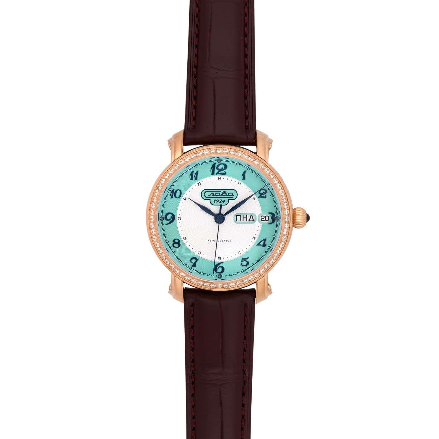 Наручные часы Слава Слава России 7443617/300-2427-68 — воплощение классического стиля и исключительного качества, произведенные в России. Эта модель из лимитированной коллекции станет великолепным дополнением к вашему образу. Часы оснащены надежным механическим механизмом "Слава 2427" с автоподзаводом, обеспечивающим точный ход и оснащены двойным календарем, что позволяет всегда быть в курсе текущей даты. Корпус из нержавеющей стали с золотистым PVDPVDУльтратонкое покрытие наносится в технике вакуумного напыления, сочетает в себе нитрид титана особой прочности со слоем золота или оксида хрома. Несёт в себе декоративную или защитную функцию.-покрытием диаметром 41 мм и толщиной 14,2 мм отличается высокой прочностью и водозащитой до 5 ATM. БезельБезельВнешний ободок, закрепляющий стекло. В спортивных часах так называется поворотное кольцо с делениями на циферблате, выполняет роль таймера – замеряет отрезки времени на шкале. Неподвижный безель – элемент декора. Однонаправленно вращающийся безель на дайверских часах позволяет фиксировать моменты погружения и выныривания на поверхность. часов с вставками из камней циркона. Серебристо-бирюзовый циферблат с арабскими цифрами защищен сапфировым стекломСапфировое стеклоПрочный и надёжный материал из кристалла сапфира синтетического происхождения, характеризующийся особой твёрдостью и устойчивостью к царапинам и повреждениям., устойчивым к царапинам, что позволяет надолго сохранить безупречный вид часов. На 3 часах расположено окошко с указателем даты и дня недели. Кожаный ремень из крокодила с застежкой «бабочка»Застёжка "бабочка"Такой вид застёжки дополняется предохранителями, помогающими избежать случайного раскрытия браслета. Обладают изящным исполнением. добавляет элегантности и комфорта, создавая ощущение роскоши и изысканности. Эта модель станет идеальным выбором для тех, кто ценит традиции и высокое качество в сочетании с современным дизайном.
