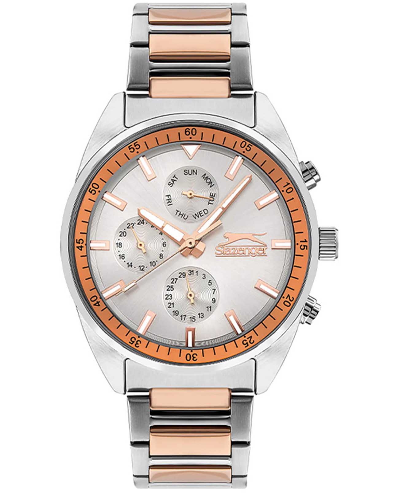 Slazenger SL.09.2040.2.03 — стильные мужские часы, сочетающие элегантный дизайн и функциональность. Корпус выполнен из суперметалла, придающей модели прочность и долговечность. Минеральное стеклоМинеральное стеклоМинеральное стекло представляет собой искусственно выращенный минерал кварца. Такое стекло отличается особой устойчивостью к повреждениям и царапинам. Уступает по некоторым качествам сапфировому стеклу. защищает циферблат от царапин и гарантирует превосходную читаемость. Циферблат с дополнительными индикаторами подчёркивает современный стиль. БезельБезельВнешний ободок, закрепляющий стекло. В спортивных часах так называется поворотное кольцо с делениями на циферблате, выполняет роль таймера – замеряет отрезки времени на шкале. Неподвижный безель – элемент декора. Однонаправленно вращающийся безель на дайверских часах позволяет фиксировать моменты погружения и выныривания на поверхность. с IP-покрытиемIP-покрытиеМетод ионного напыления. Демонстрирует повышенную устойчивость к истиранию, окислению и химическим веществам. Под воздействием высокого давления и температуры около 1500°C молекулы металла надёжно соединяются с частицами корпуса часов.. Браслет из суперметалла с PVD-покрытиемPVDУльтратонкое покрытие наносится в технике вакуумного напыления, сочетает в себе нитрид титана особой прочности со слоем золота или оксида хрома. Несёт в себе декоративную или защитную функцию. обеспечивает комфортное ношение и надёжную фиксацию на запястье. Функциональность дополняется индикацией даты, дня недели и 24-часовым форматом времени, повышая удобство использования. Водонепроницаемость 50 метров делает модель устойчивой к случайным брызгам и влаге, идеально подходя для повседневного ношения.