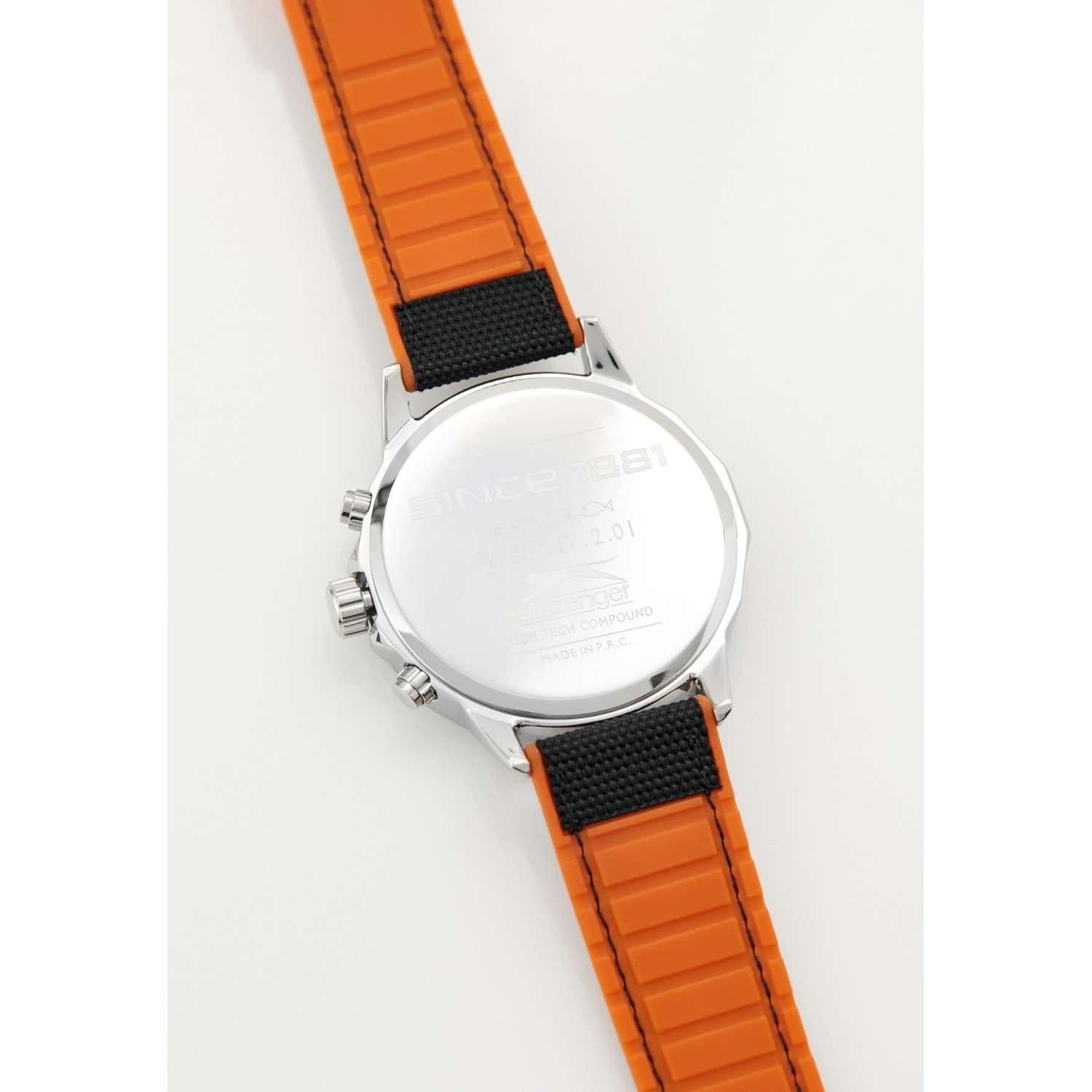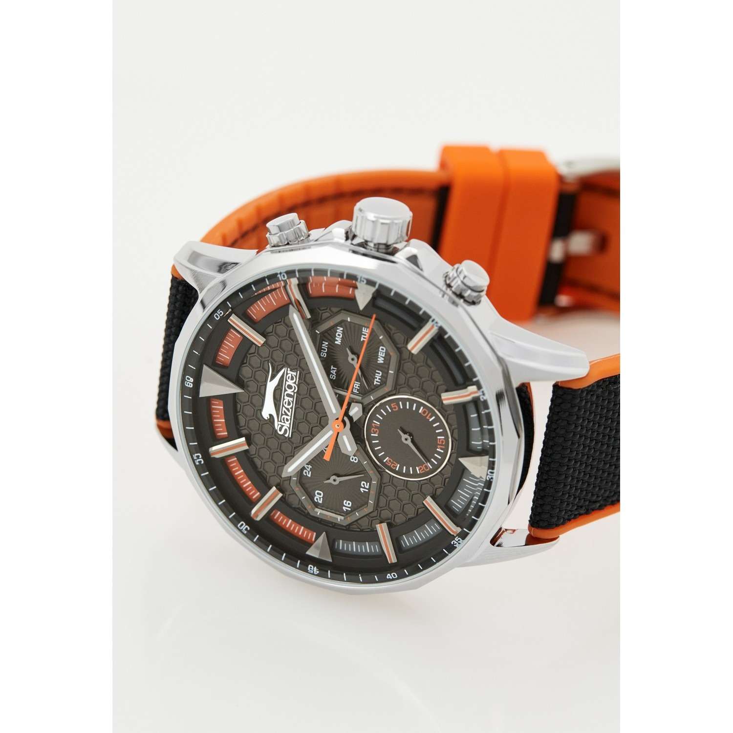 Стильные мужские наручные часы Slazenger SL.09.2217.2.01 станут идеальным аксессуаром для современного мужчины. Этот британский бренд славится своим качеством и надежностью, а данная модель не является исключением. Часы оснащены кварцевым механизмом, что обеспечивает точность хода и долговечность использования. Корпус часов выполнен из металла, а прочное минеральное стеклоМинеральное стеклоМинеральное стекло представляет собой искусственно выращенный минерал кварца. Такое стекло отличается особой устойчивостью к повреждениям и царапинам. Уступает по некоторым качествам сапфировому стеклу. защищает циферблат от царапин и повреждений. Элегантный черный тканевый ремешок на оранжевом силиконовом основании с классической застежкой, что гарантирует комфортное ношение на запястье. Ширина браслета составляет 22 мм, что придает часам солидный вид. Диаметр корпуса равен 45 мм, а толщина 12 мм, что делает эту модель заметной, но в то же время не громоздкой. Водозащита уровня WR 50 позволяет использовать часы в повседневной жизни, не беспокоясь о случайных попаданиях воды. Стрелки снабжены люминесцентным покрытиемЛюминесцентное покрытиеПозволяет считывать показания времени в темноте. Производители наносят на стрелки, часовые индексы, безель или поверхность циферблата светонакопительный состав, дающий холодное свечение., что позволяет легко считывать время в темноте. Функциональные возможности часов включают отображение даты, дня недели и времени в 24-часовом формате на дополнительных малых циферблатах. Это делает модель не только стильной, но и практичной в использовании.
