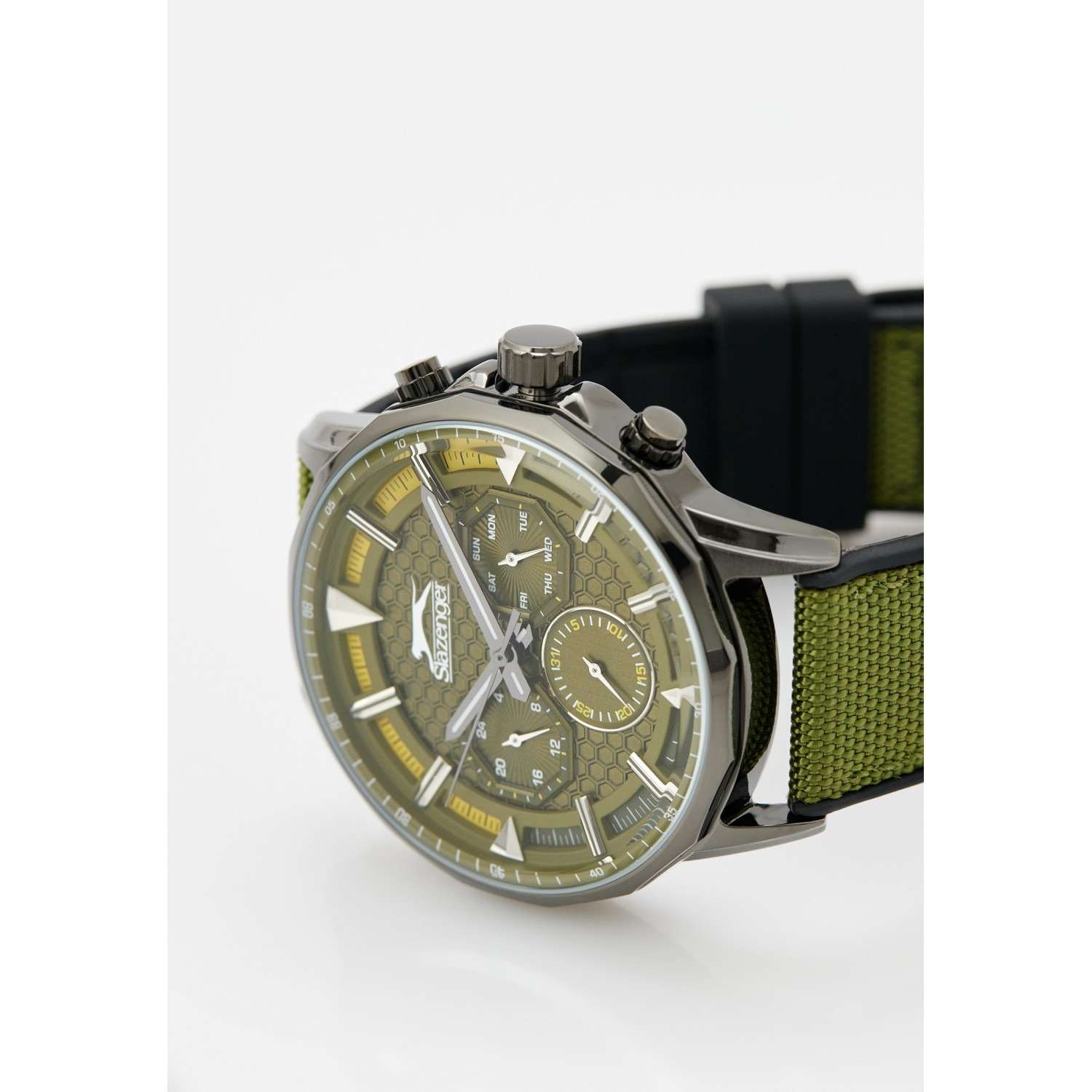Стильные мужские наручные часы Slazenger SL.09.2217.2.03 станут идеальным аксессуаром для современного мужчины. Этот британский бренд славится своим качеством и надежностью, а данная модель не является исключением. Часы оснащены кварцевым механизмом, что обеспечивает точность хода и долговечность использования. Корпус часов выполнен из металла с черным IP-покрытиемIP-покрытиеМетод ионного напыления. Демонстрирует повышенную устойчивость к истиранию, окислению и химическим веществам. Под воздействием высокого давления и температуры около 1500°C молекулы металла надёжно соединяются с частицами корпуса часов., а прочное  минеральное стеклоМинеральное стеклоМинеральное стекло представляет собой искусственно выращенный минерал кварца. Такое стекло отличается особой устойчивостью к повреждениям и царапинам. Уступает по некоторым качествам сапфировому стеклу. защищает циферблат от царапин и повреждений. Элегантный зеленый тканевый ремешок на черном силиконовом основании с классической застежкой, что гарантирует комфортное ношение на запястье. Ширина браслета составляет 22 мм, что придает часам солидный вид. Диаметр корпуса равен 45 мм, а толщина 12 мм, что делает эту модель заметной, но в то же время не громоздкой. Водозащита уровня WR 50 позволяет использовать часы в повседневной жизни, не беспокоясь о случайных попаданиях воды. Стрелки снабжены люминесцентным покрытиемЛюминесцентное покрытиеПозволяет считывать показания времени в темноте. Производители наносят на стрелки, часовые индексы, безель или поверхность циферблата светонакопительный состав, дающий холодное свечение., что позволяет легко считывать время в темноте. Функциональные возможности часов включают отображение даты, дня недели и времени в 24-часовом формате на дополнительных малых циферблатах. Это делает модель не только стильной, но и практичной в использовании.