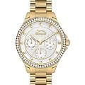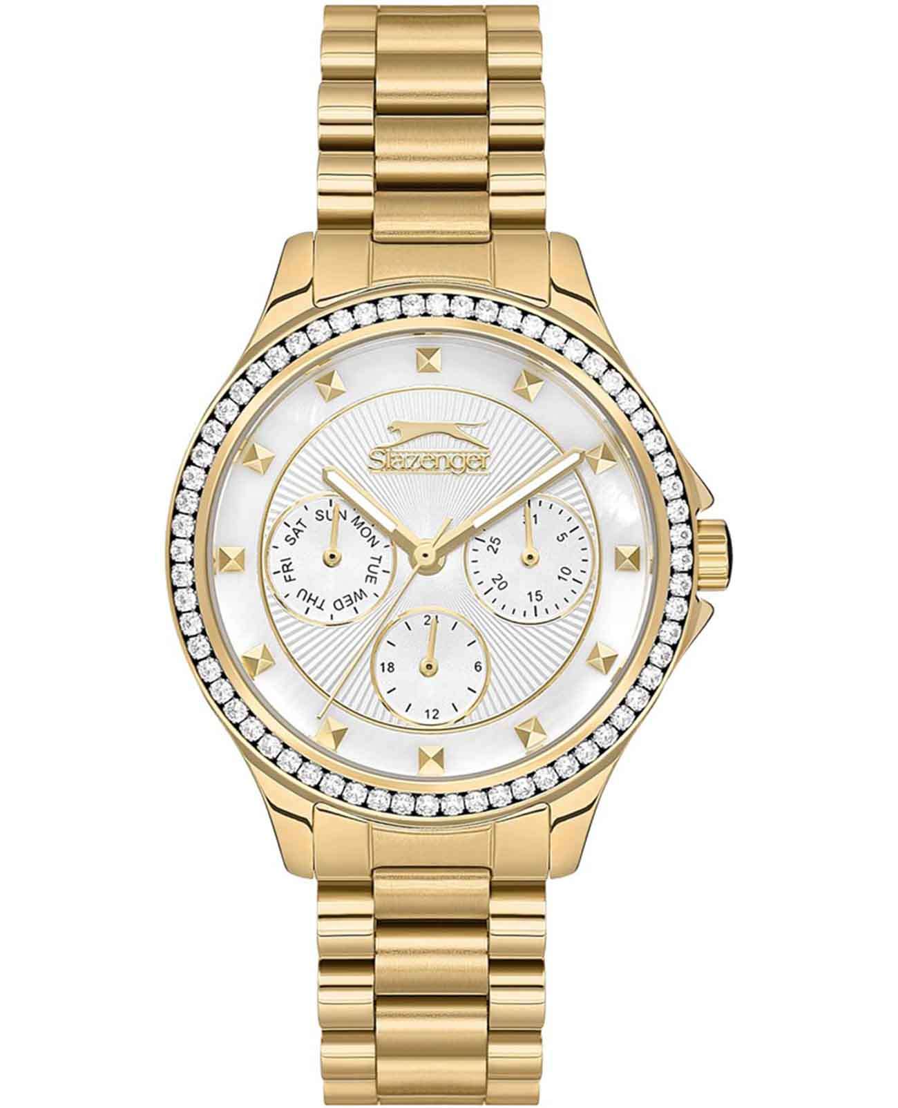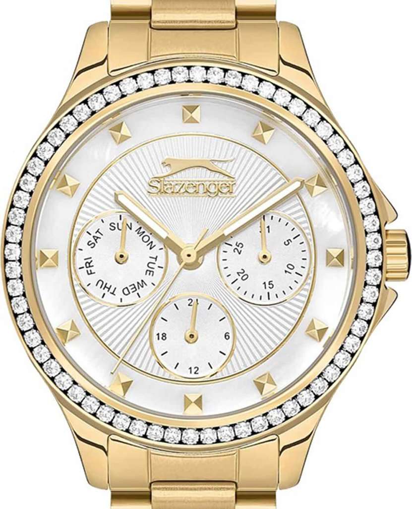 Эти женские часы Slazenger SL.09.2241.4.06 выполнены в современном стиле и станет элегантным дополнением к любому образу. Корпус и браслет изготовлены из прочного металла золотистого цвета с IP-покрытиемIP-покрытиеМетод ионного напыления. Демонстрирует повышенную устойчивость к истиранию, окислению и химическим веществам. Под воздействием высокого давления и температуры около 1500°C молекулы металла надёжно соединяются с частицами корпуса часов., безельБезельВнешний ободок, закрепляющий стекло. В спортивных часах так называется поворотное кольцо с делениями на циферблате, выполняет роль таймера – замеряет отрезки времени на шкале. Неподвижный безель – элемент декора. Однонаправленно вращающийся безель на дайверских часах позволяет фиксировать моменты погружения и выныривания на поверхность. украшен изящными кристаллами, которые придают часам особую привлекательность. На циферблате расположены дополнительные малые циферблаты для отображения даты, дня недели и времени в 24-часовом формате, что делает их функциональными и удобными для ежедневного использования. Минеральное стеклоМинеральное стеклоМинеральное стекло представляет собой искусственно выращенный минерал кварца. Такое стекло отличается особой устойчивостью к повреждениям и царапинам. Уступает по некоторым качествам сапфировому стеклу. надежно защищает циферблат от царапин, а водозащита уровня WR 30 предохраняет механизм от случайных брызг воды. Заводная головка оснащена защитой, а стрелки имеют подсветку для легкого считывания времени в темноте. Диаметр корпуса составляет 34 мм, ширина браслета — 16 мм, толщина корпуса — 9 мм. Часы фиксируются на руке с помощью удобной раскладной застёжкиРаскладная застёжкаТакой тип застёжки используется только на браслетах из металла. Она никогда не раскрывается полностью, происходит разделение на 2 и более частей. Раскладывающая застёжка снизит вероятность потери часов к минимуму.. Вес изделия подобран для комфортной ежедневной носки. Для удобства использования в темное время суток предусмотрено люминесцентное покрытиеЛюминесцентное покрытиеПозволяет считывать показания времени в темноте. Производители наносят на стрелки, часовые индексы, безель или поверхность циферблата светонакопительный состав, дающий холодное свечение. стрелок.